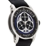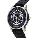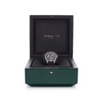 The Audemars Piguet ‘Starwheel’ is crafted in a 41mm, two-toned black ceramic and white gold case and styled on a rubber coated strap. The blue aventurine dial reimagines a starry night as the backdrop to three black-pvd coated wandering hour discs in the center. The disks wander around the dial every hour, while the correct hour disk points to the minutes featured along the top edge of the dial.
