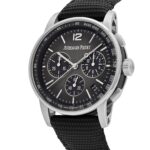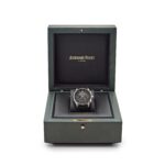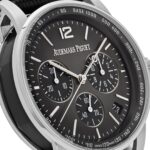 This Audemars Piguet? is designed in a 41mm 18k white gold and black ceramic?case with a smooth round bezel. It features a lacquered smoked grey dial with three sub-dials. Its functions include an integrated column-wheel chronograph mechanism and flyback capabilities, allowing an instant restart of the stopwatch without stopping and resetting the time.