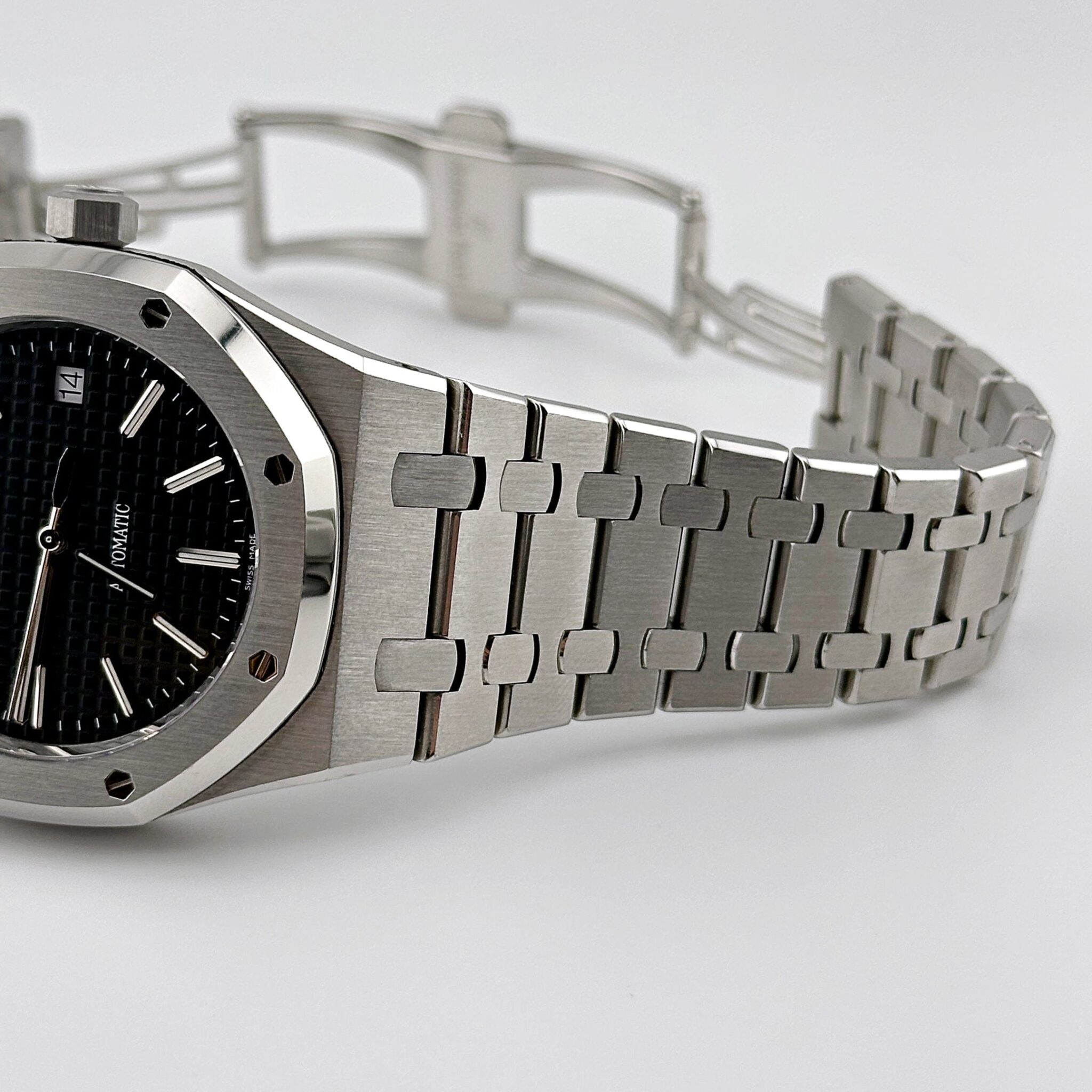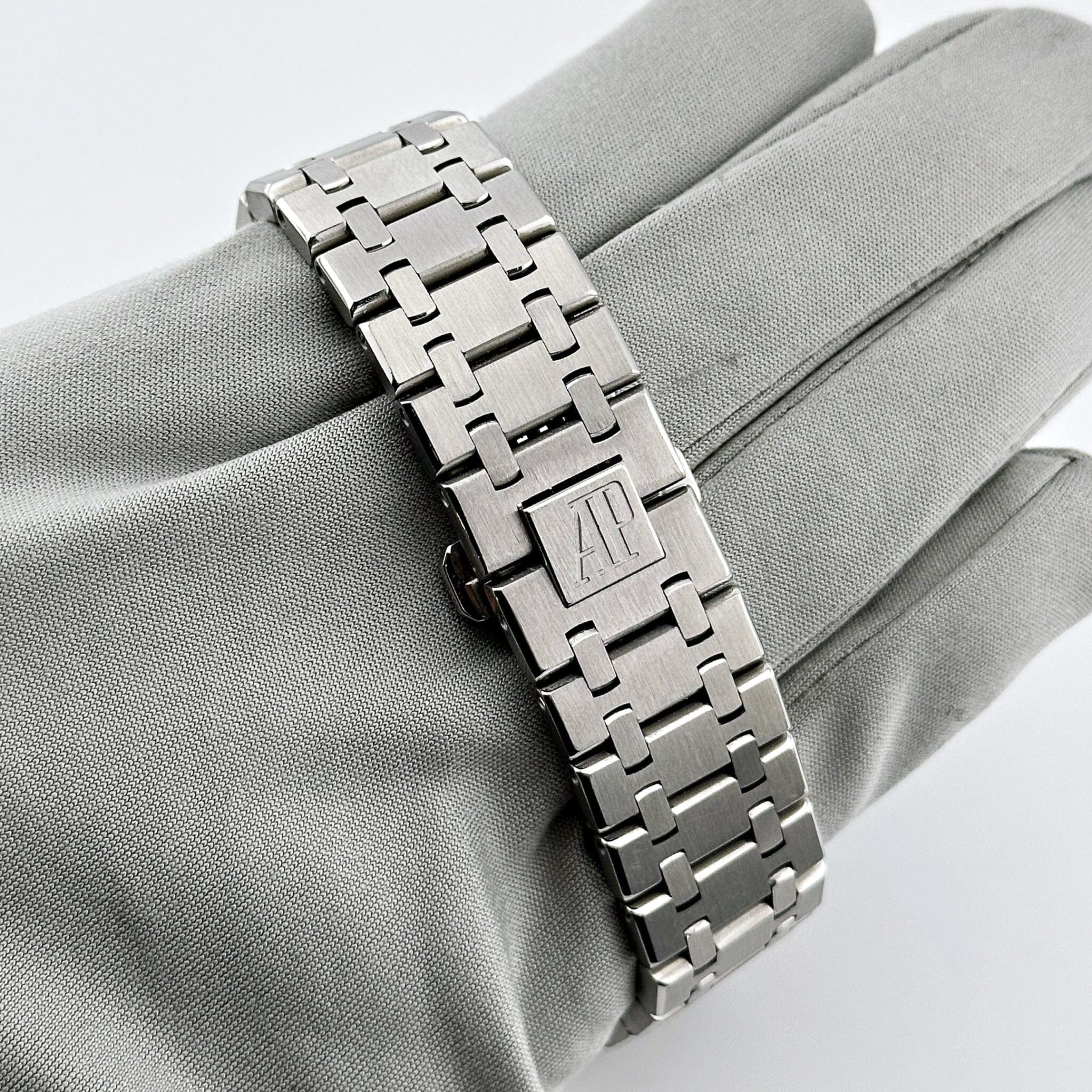 The black?Grande Tapisserie?dial adds depth and texture, offering a bold contrast to the steel case. White gold applied hour markers and Royal Oak hands with luminescent coating ensure excellent readability, while the date window at 3 o??clock integrates seamlessly into the symmetrical layout.