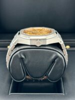 The pink gold-toned dial provides a striking contrast against the stainless steel, highlighting the detailed architecture and craftsmanship of the exposed movement. The iconic Royal Oak octagonal bezel and ??Tapisserie?? design add a touch of classic elegance to this modern marvel. Ideal for collectors who appreciate technical excellence paired with sophisticated style, the 15407ST.OO.1220ST.02 is a standout piece that combines the Royal Oak??s timeless design with a contemporary, openworked aesthetic.