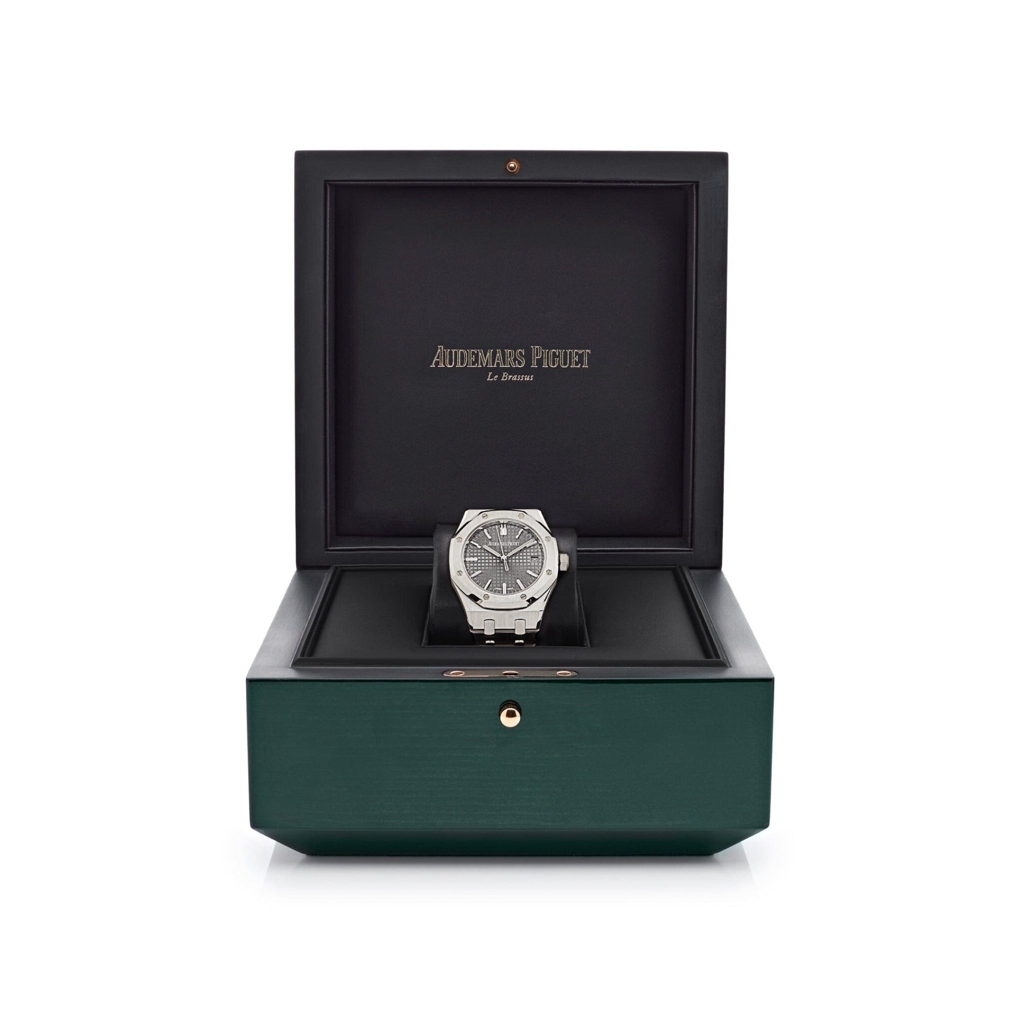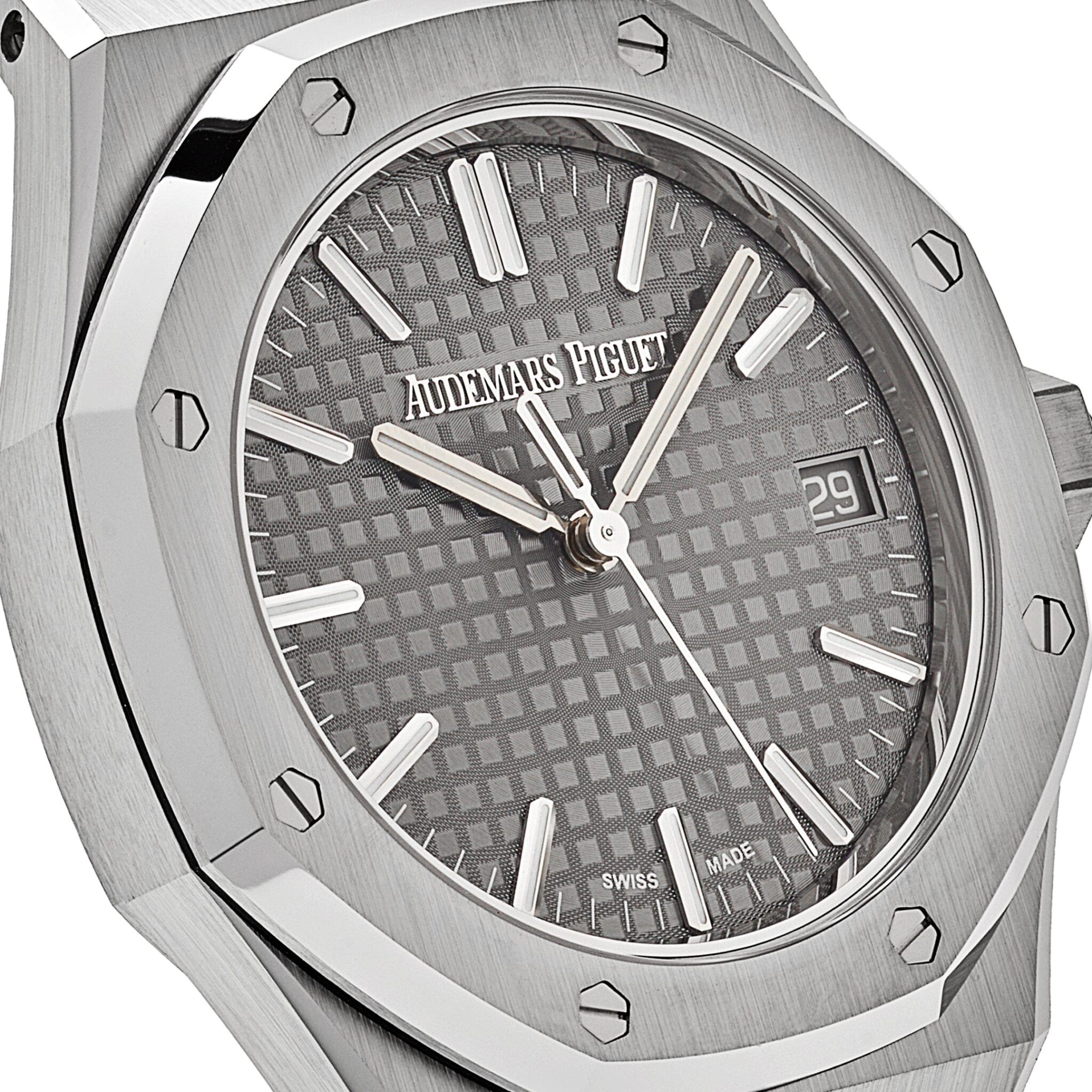 This 15550ST.OO.1356ST.03 ??50th Anniversary?? is crafted in a stainless steel case measuring 37mm. The grey dial features the ??Grande Tapisserie?? pattern with white gold applied hour-markers and Royal Oak hands with luminescent coating.
