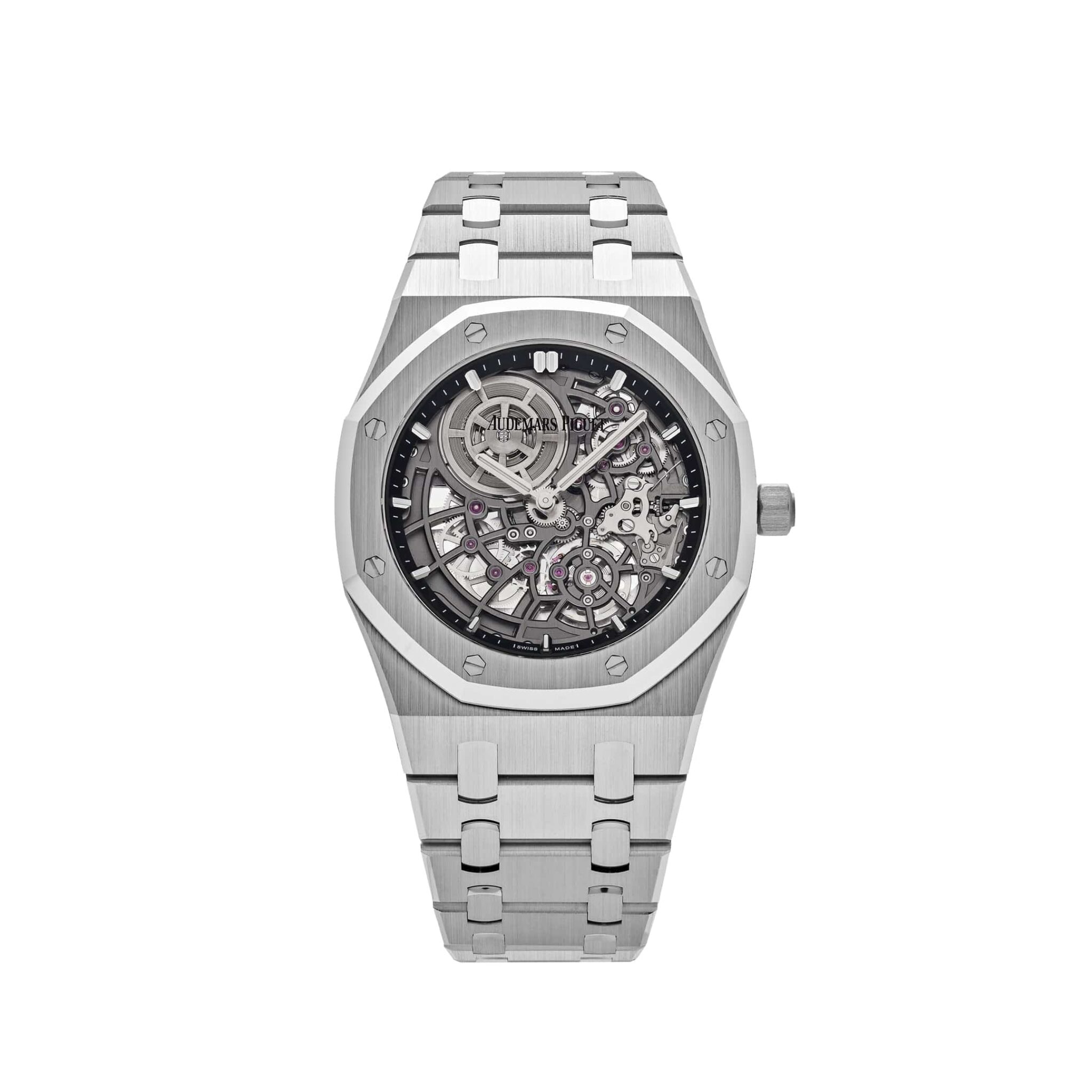 The Audemars Piguet 16204BC.OO.1240BC.01 is crafted in a 39mm white gold case and styled on matching white gold bracelet. The dark gray hues of intricate mechanics of Caliber 7124 are showcased in the dial. Meant to be admired on both sides of the watch, the sapphire crystal and exhibition case back provide a unique view into the heart of the piece.