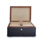This features a 44mm rose gold case, rose gold bezel with screw-locked crown, and a handsome black dial with the “Grande Tapisserie” pattern. On the movement side, there is a power reserve indicator embedded directly in the three-quarter plate. The watch comes on a black leather strap with rose gold folding clasp.