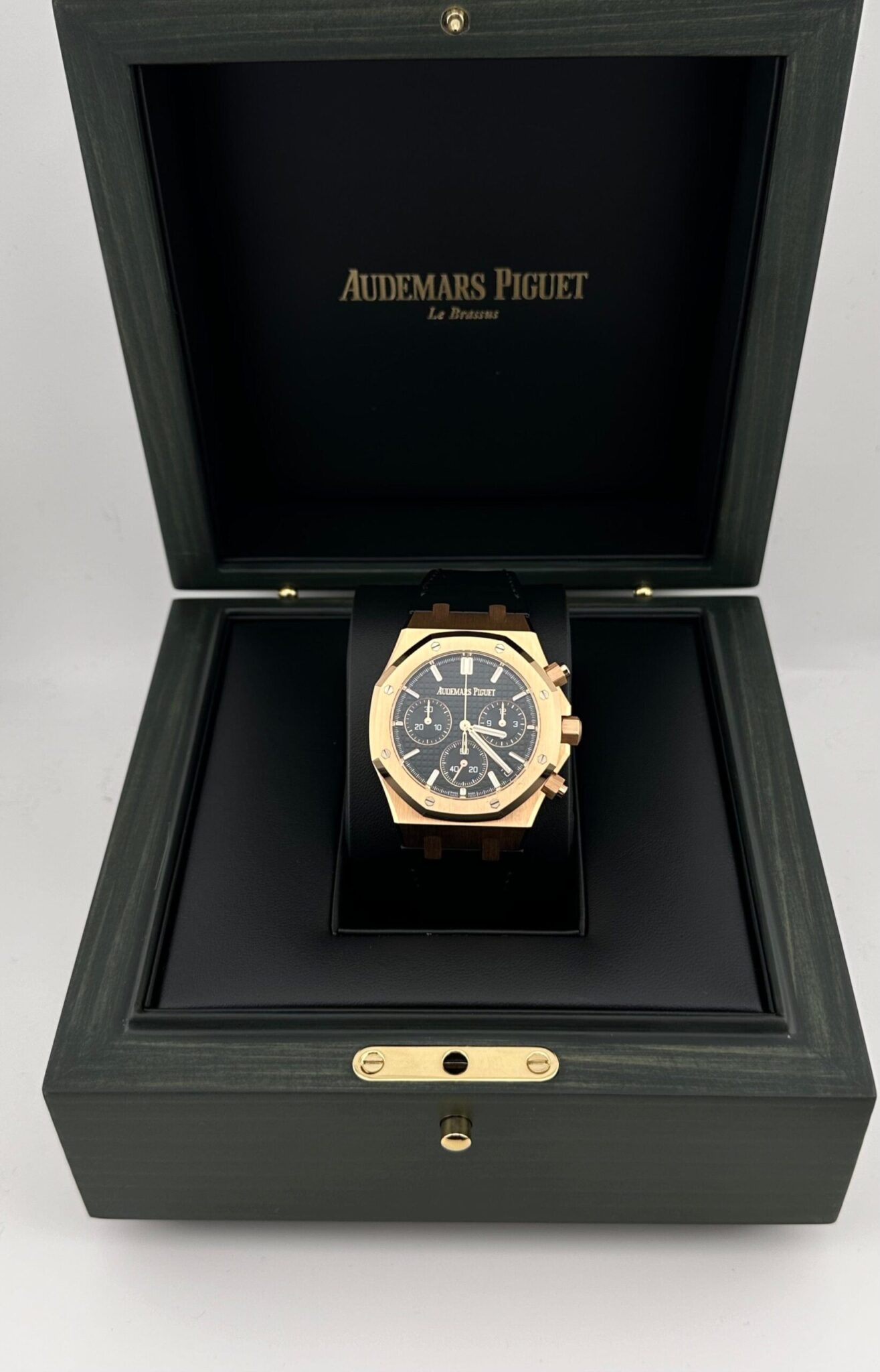 The Selfwinding is designed with an 18-carat rose gold case measuring 41mm and includes the new Royal Oak design advancement. It has a black dial with a “Grande Tapisserie” pattern, rose gold applied hour-markers and Royal Oak hands with luminescent coating, and hosts a date window at 3 o’clock. The watch comes on a black alligator strap with an 18-carat rose gold AP folding clasp.