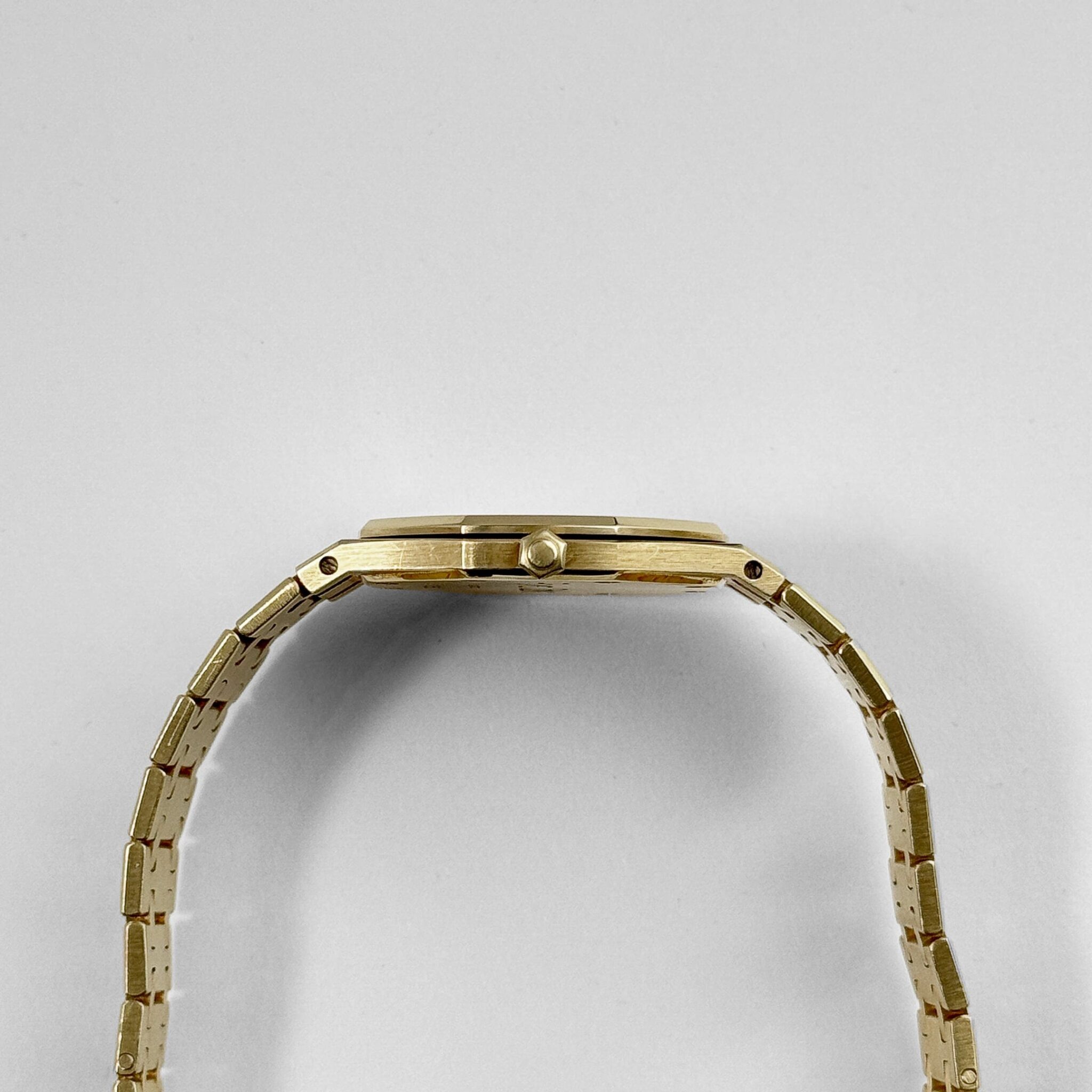 The?Audemars Piguet 56175BA?is a refined vintage timepiece that showcases the timeless elegance of the?Royal Oak?in a more compact?33mm?case. Crafted in?18k yellow gold, the watch retains the iconic?octagonal bezel?with exposed screws, a hallmark of?G??rald Genta??s?legendary design. The integrated yellow gold bracelet enhances its sleek, sophisticated aesthetic, making it a true statement of understated luxury.