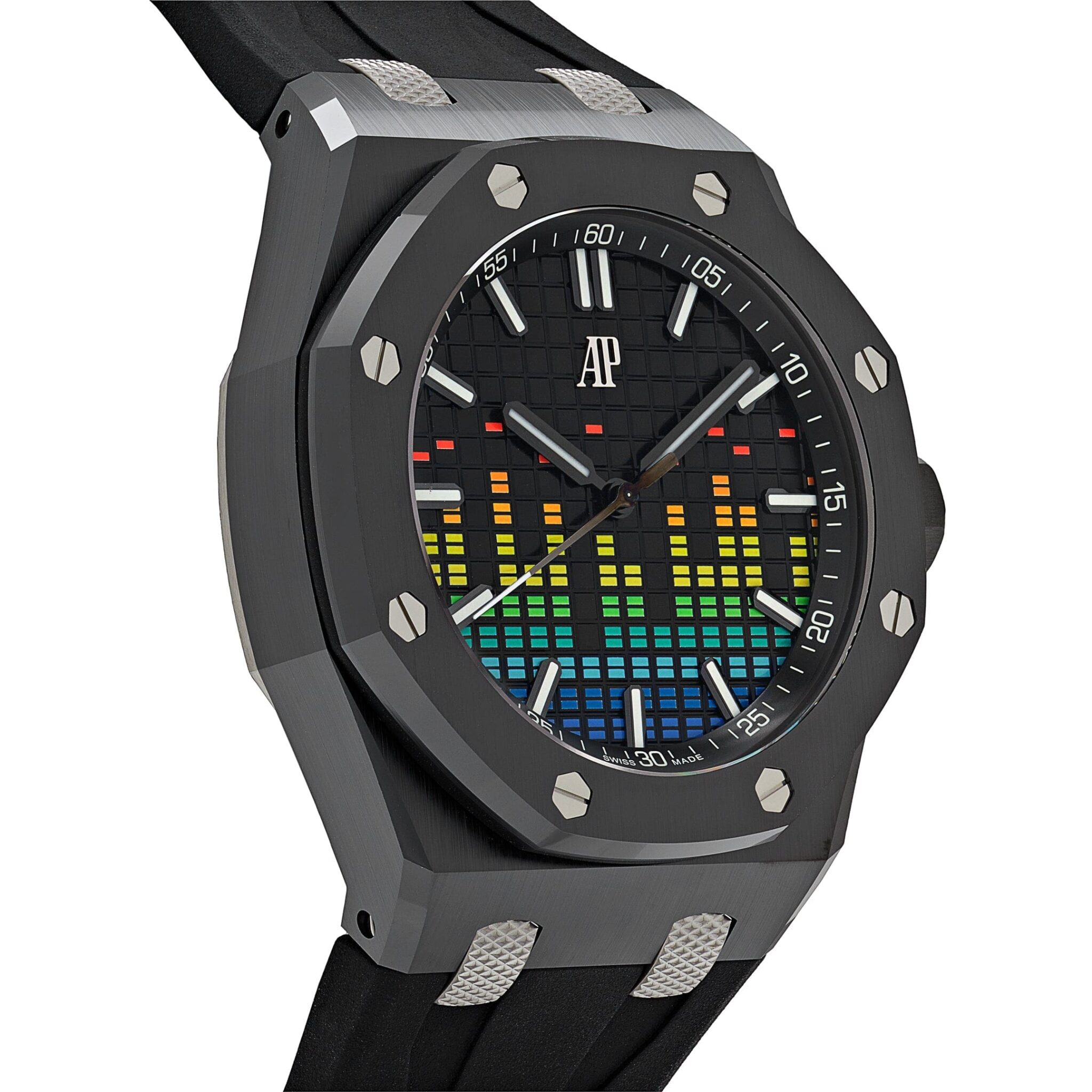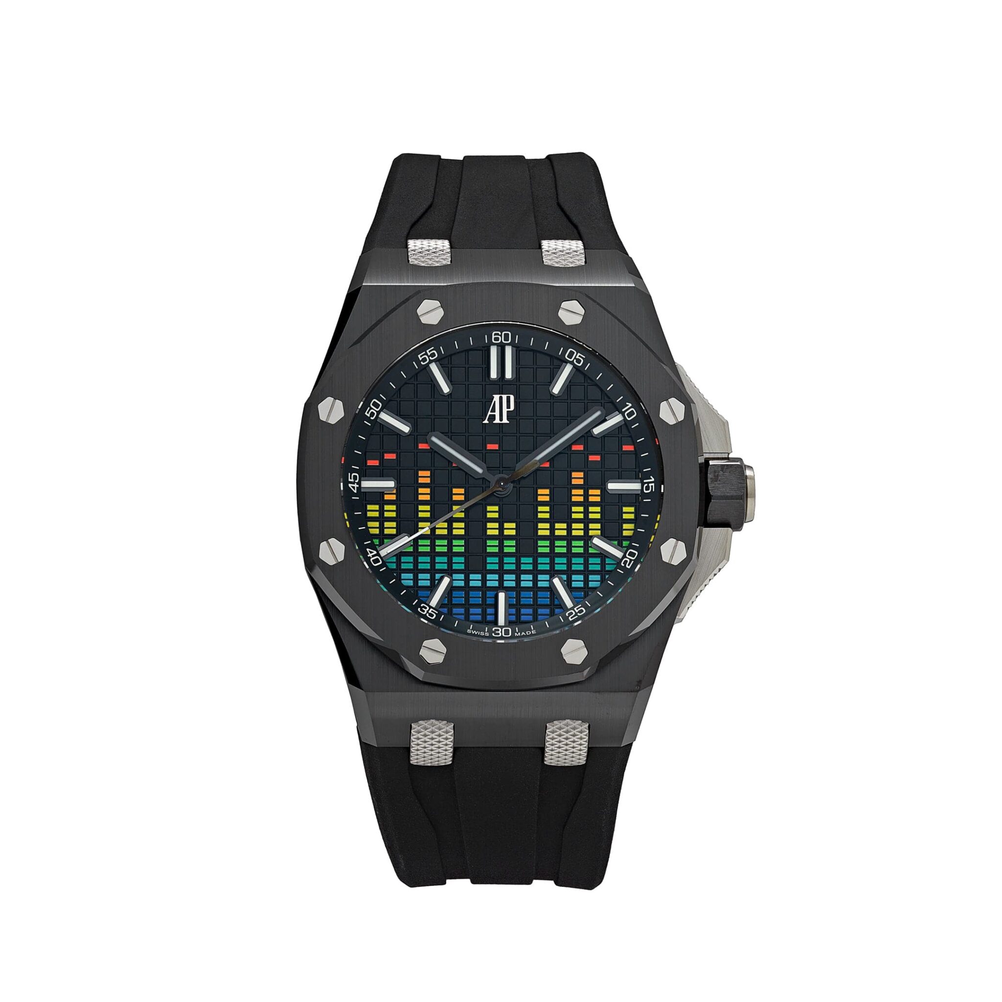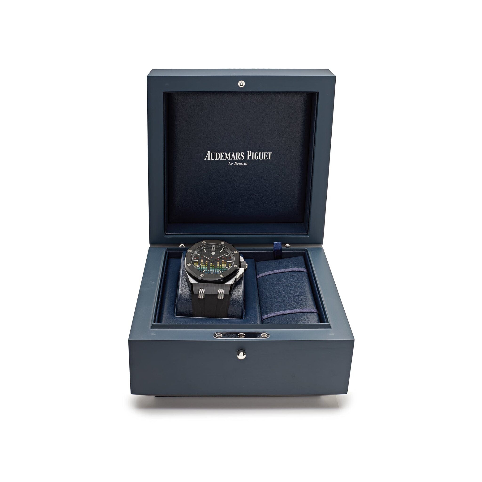 Introducing the Audemars Piguet Selfwinding ‘Music Edition’ 15600CE.OO.A002CA.01. This limited edition the 43mm piece has a retro technicolor design that nods at the recording studio technology it was inspired by. Blackened white gold luminescent hand and hour markers work with the Sapphire glare-proofed crystal for optimal legibility in any condition. An exhibition case back gives a glimpse at the Calibre 4309 movement. With all the flare and an array of colorful strap options, this watch lets you beat to your drum.