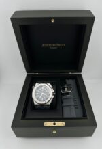 The Audemars Piguet is accentuated by a 42mm stainless steel case and styled on a navy blue rubber strap. In the center inlays a grey Mega Tapisserie dial with luminous white applied hour-markers and Royal Oak hands. This watch can withstand up to 300 meters of water resistance while the diving scale and zone from 60 to 15 minutes (controlled by the blue rotating inner bezel ring) continue to keep their functionality.
