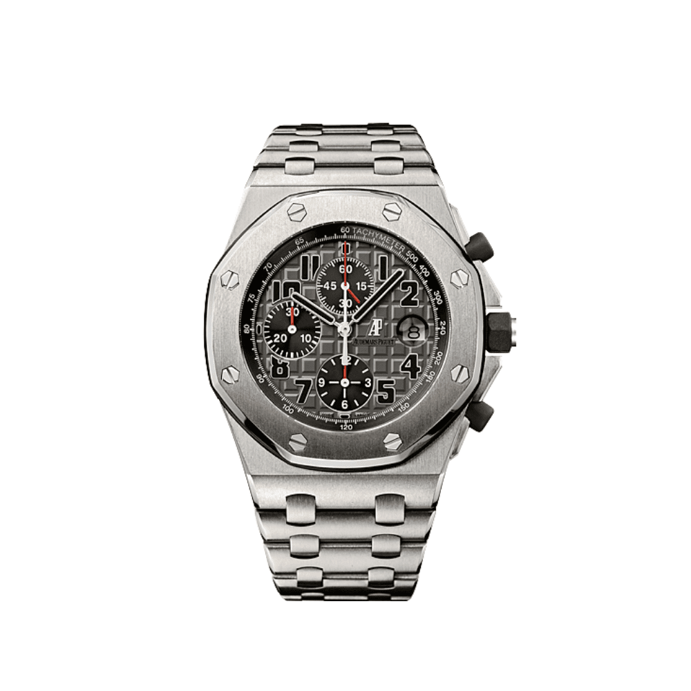 The grey M??ga Tapisserie dial adds depth and texture, complemented by contrasting black chronograph subdials and a date display at 3 o??clock. The red accents on the chronograph hands provide a dynamic pop of color, while luminescent-coated hour markers and Royal Oak hands ensure excellent legibility in any lighting.