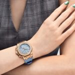 This Selfwinding is crafted in a rose gold case measuring 37mm. The brilliant-cut diamond bezel surrounds a light blue dial featuring the ‘Lady Tapisserie’ pattern, blue counters, pink gold applied hour-markers and Royal Oak hands with luminescent coating. The watch comes with a blue rubber strap and white rubber strap with 18k pink gold pin buckle.