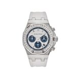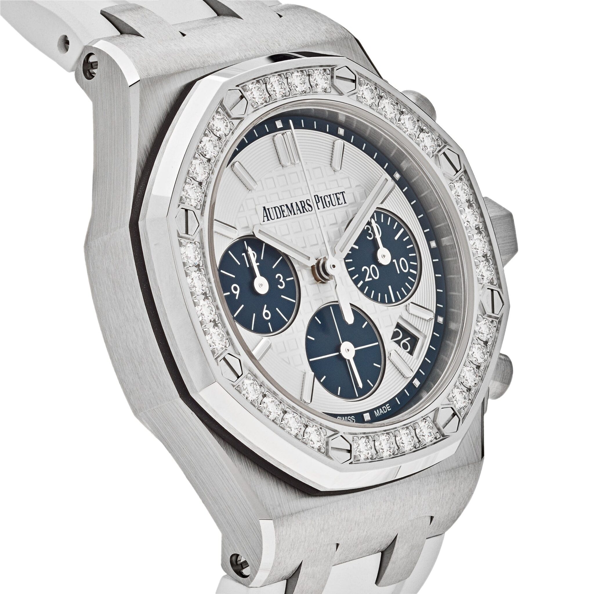 The Audemars Piguet 26231ST.ZZ.D010CA.01.A Selfwinding . The 37mm stainless steel case hosts a diamond bezel, a silver dial with a Lady Tapisserie pattern, blue sub-dials, a blue inner bezel ring, and styled on a white rubber strap. Luminescent hand and hour markers work with the Sapphire glare-proofed crystal for optimal legibility in any condition. Complications include chronograph functions, hours, minutes, small seconds, and date features.
