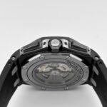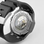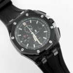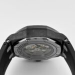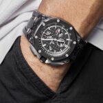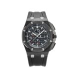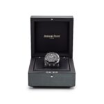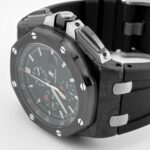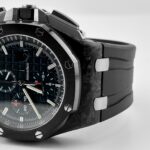 The Audemars Pigue Chronograph26400AU.OO.A002CA.01 stands out with its bold use of forged carbon for the 44mm case??a material that??s lightweight, robust, and highly distinctive. The black ceramic bezel, crown, and pushers elevate the stealth aesthetic, while titanium elements add contrast and structure.