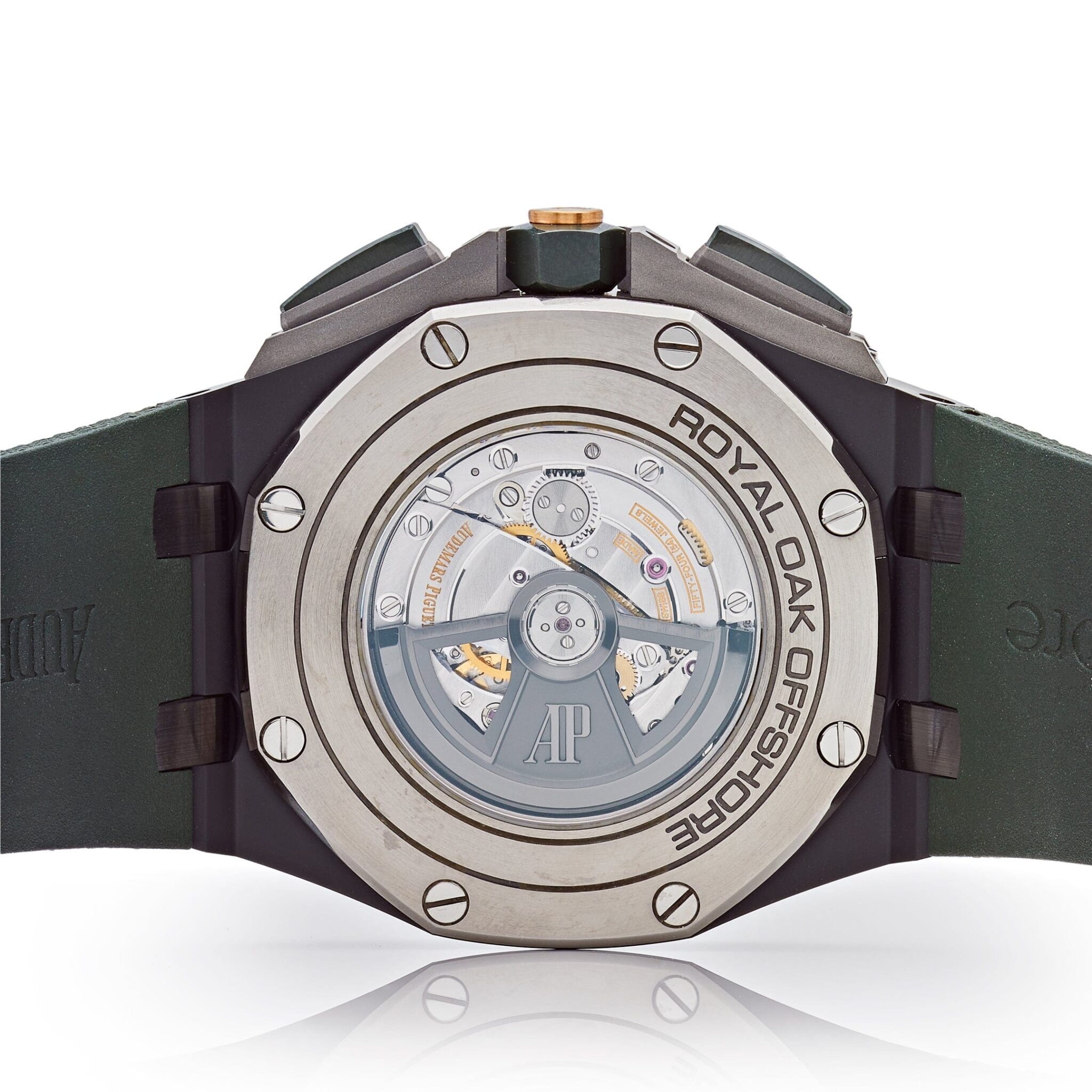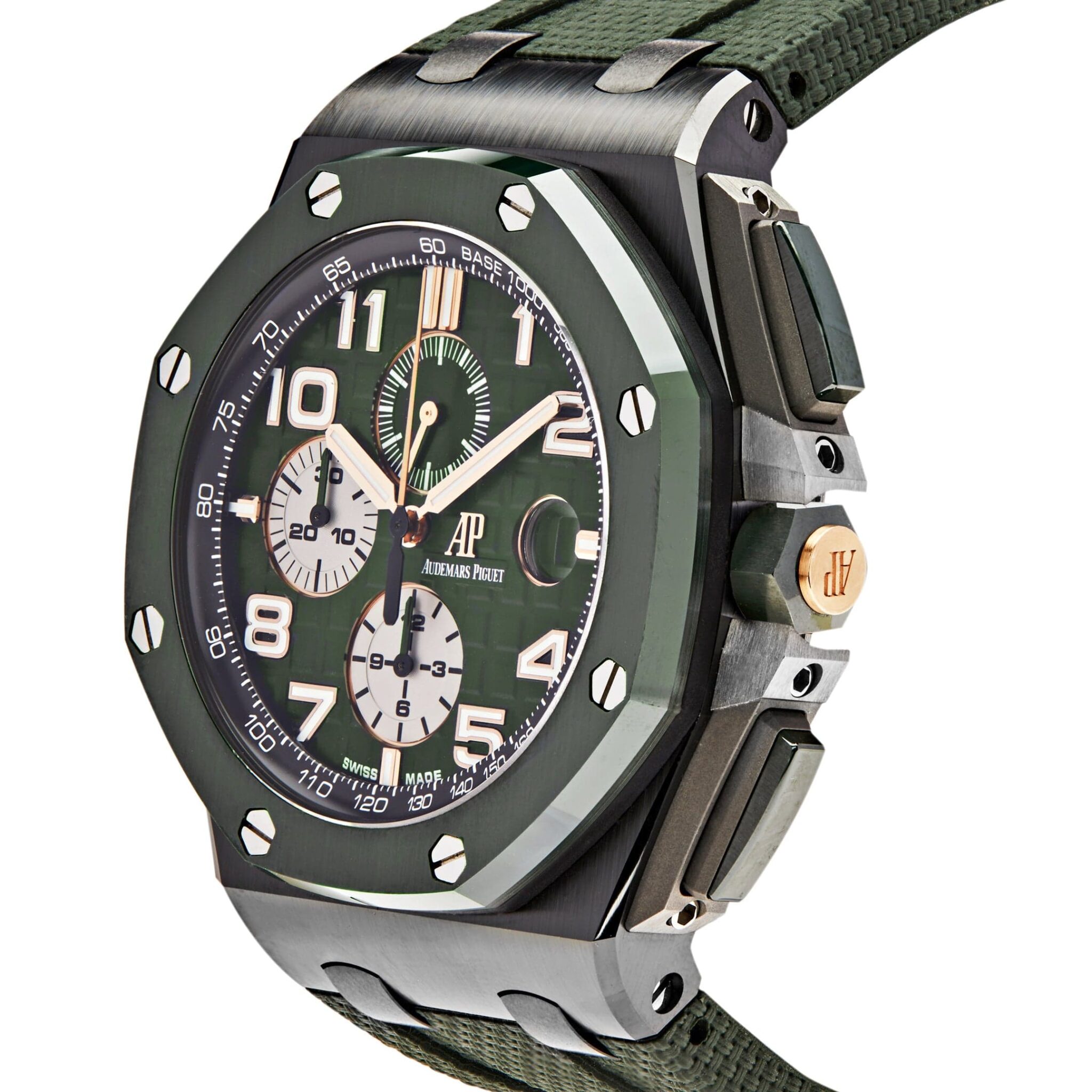 The Audemars Piguet is designed with a 44mm black ceramic case and green ceramic bezel. In the center inlays a green Mega Tapisserie dial with luminous hands and Arabic numeral hour markers featuring white and black sub-dials. The watch comes on a green textured rubber bracelet with titanium pin buckle.