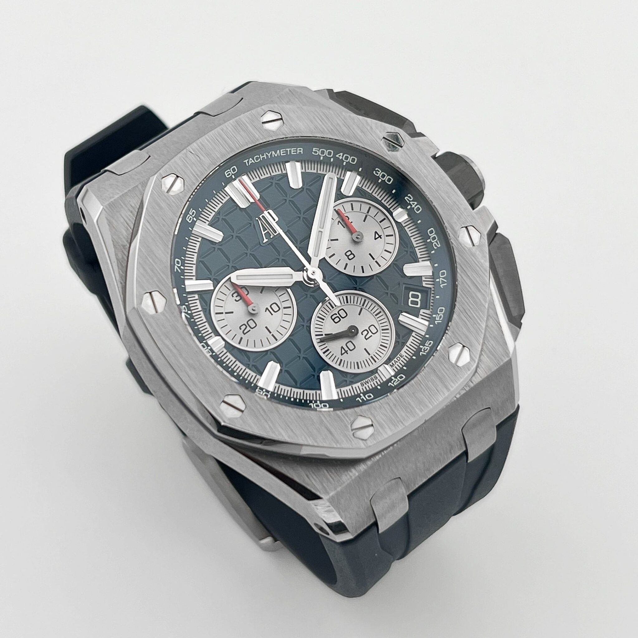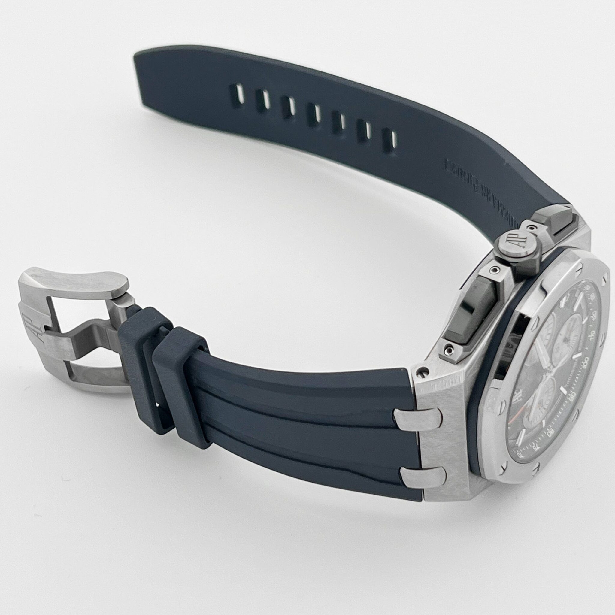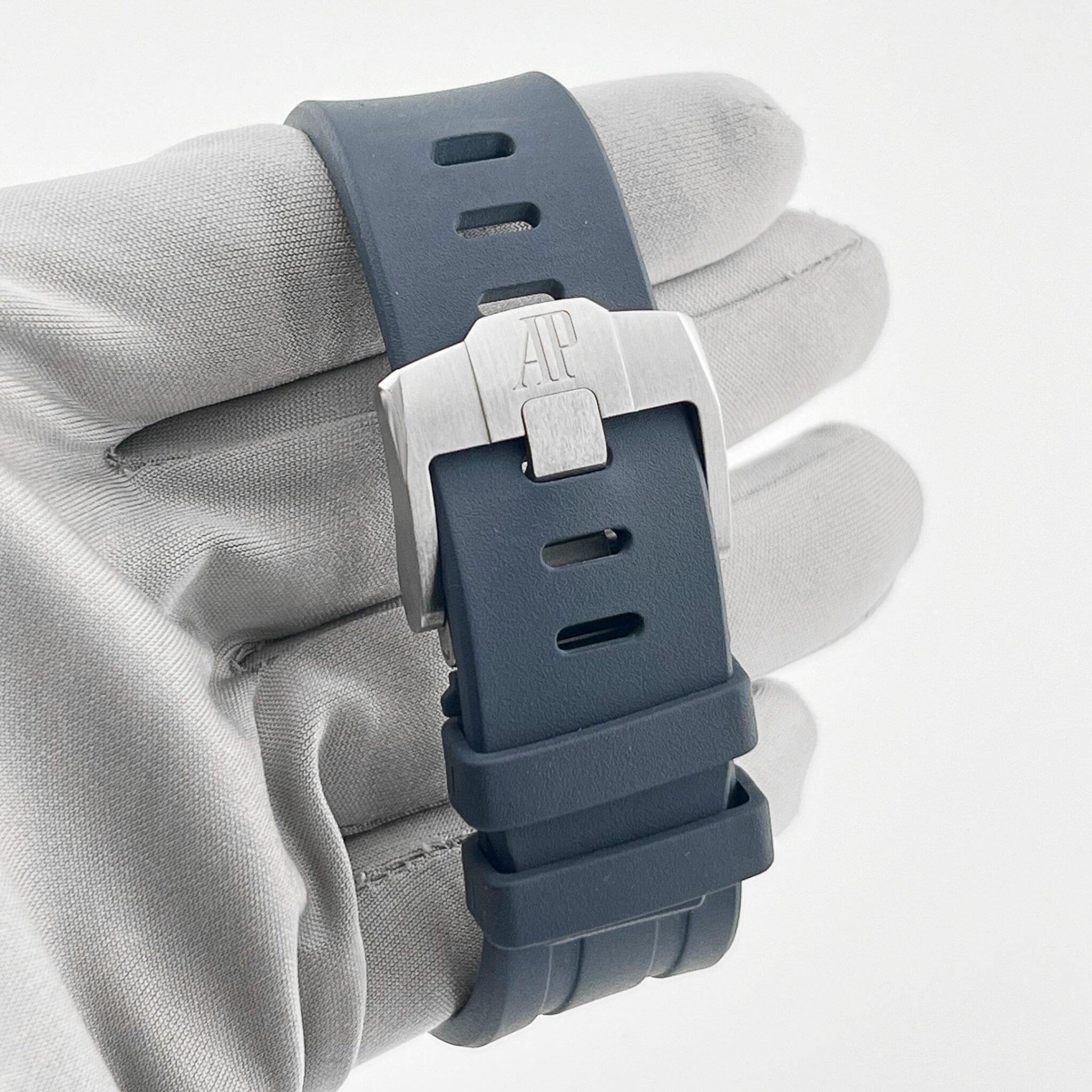Powered by Audemars Piguet??s Caliber 4401, the watch features a flyback chronograph function, a 70-hour power reserve, and a seamlessly integrated movement that delivers precision and reliability. Paired with a matching blue rubber strap, the 26420TI.OO.A027CA.01 combines technical performance with a dynamic color palette, making it a standout choice for collectors and enthusiasts seeking a versatile and robust luxury sports watch.