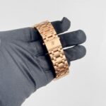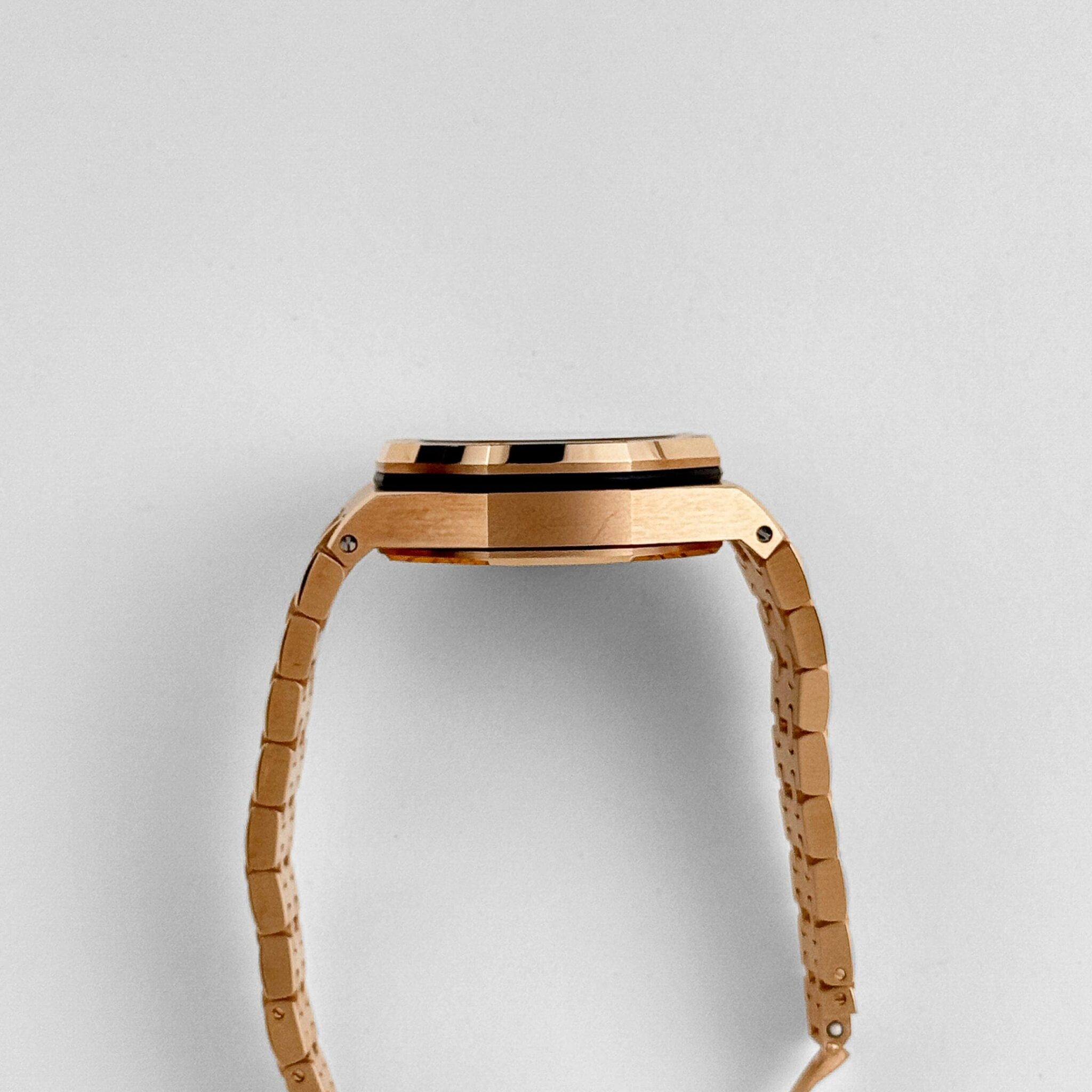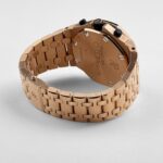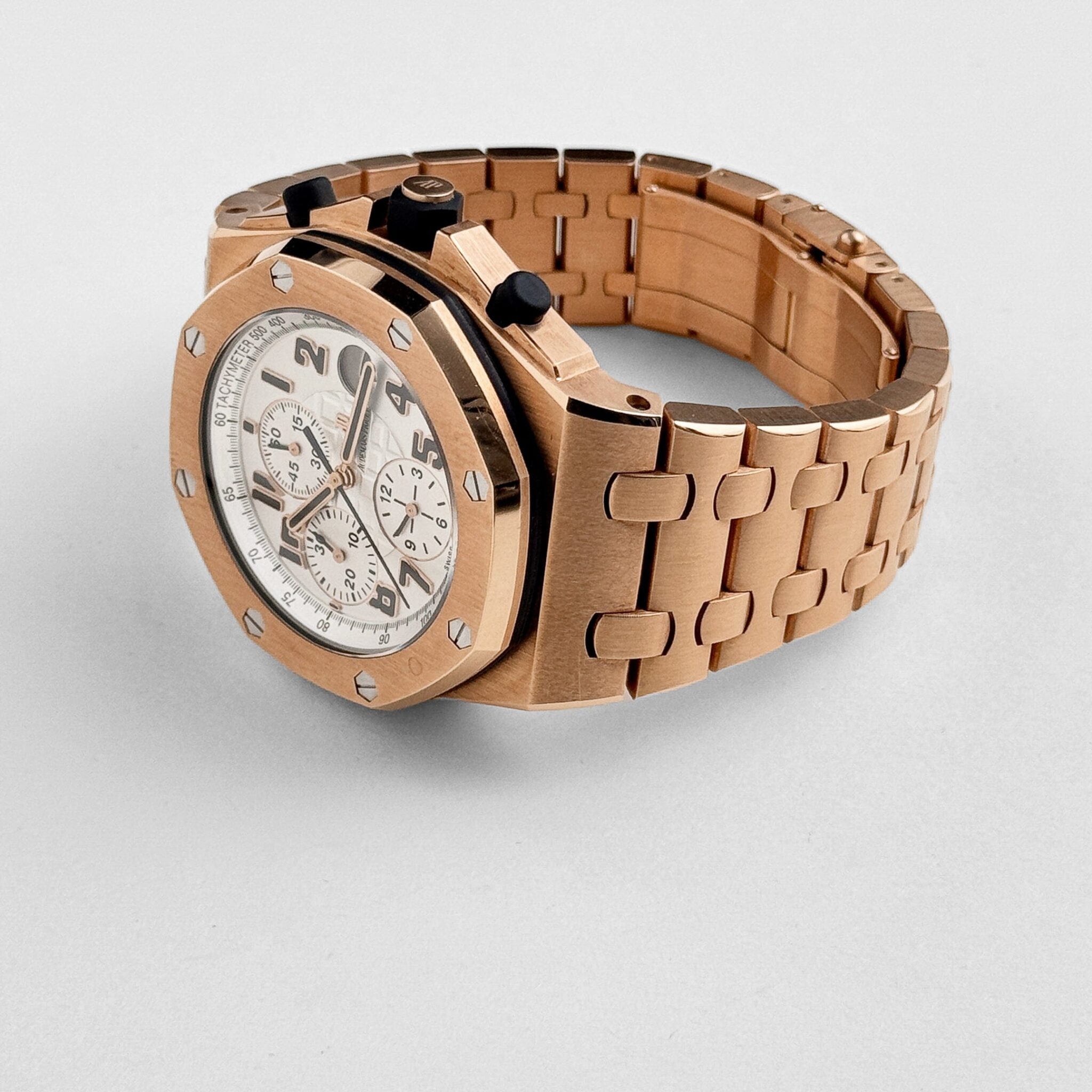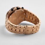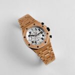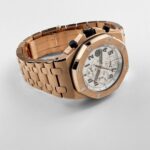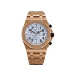 The Audemars Piguet Chronograph 26170OR.OO.1000OR.01 pairs boldness with refinement in full 18-carat rose gold. Its 42mm case and integrated bracelet give it substantial wrist presence, while the white M??ga Tapisserie dial offers a clean look with white subdials and prominent Arabic numerals for sharp legibility. The signature Royal Oak octagonal bezel is secured with exposed screws, reinforcing its sport-luxury appeal.