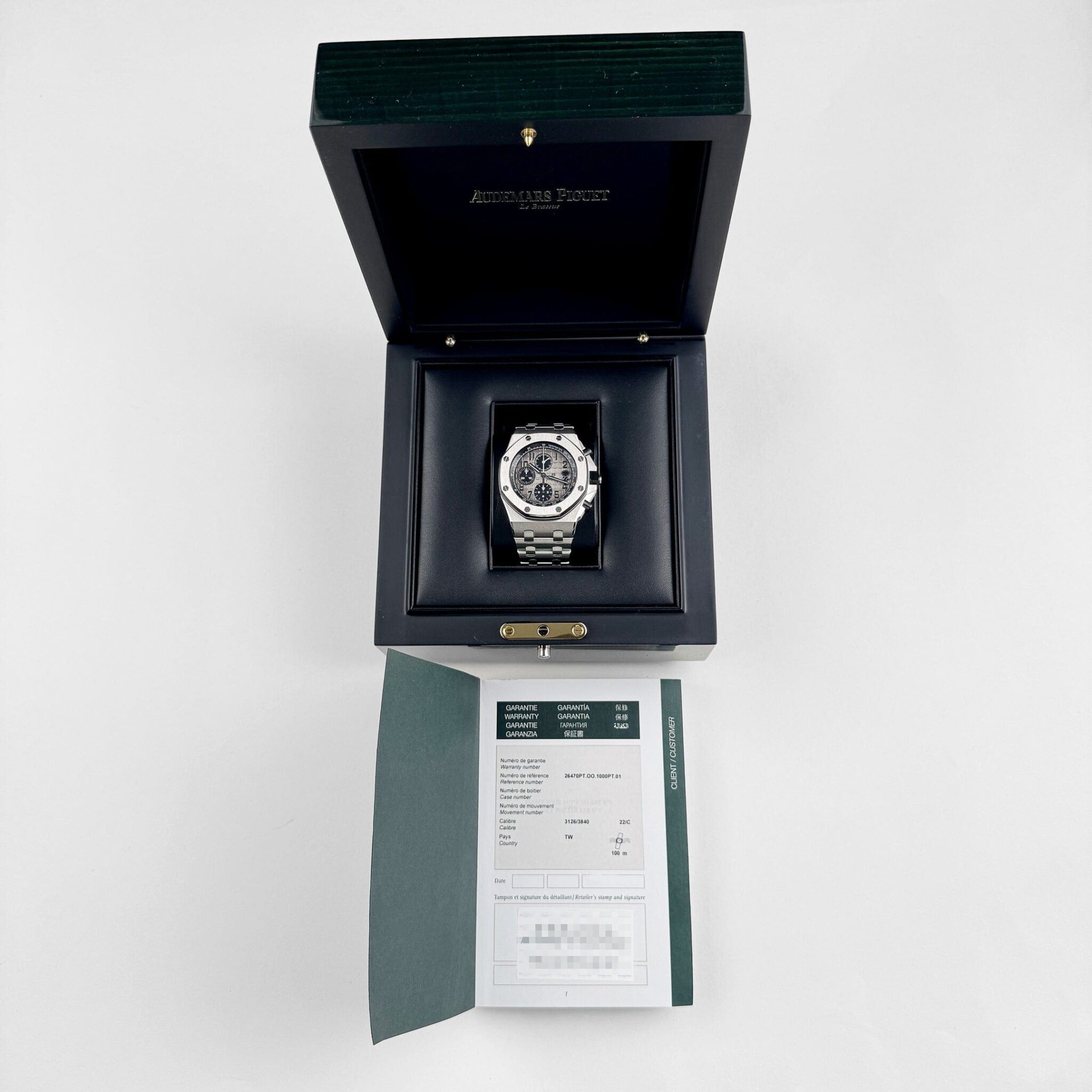 The Audemars Piguet Chronograph 26470PT.OO.1000PT.01 elevates the Offshore series with a full 42mm platinum case and bracelet??a rare and substantial expression of the collection??s boldest design codes. Its grey ??M??ga Tapisserie?? dial is complemented by black subdials, creating a sophisticated aesthetic that amplifies the presence of the platinum case.