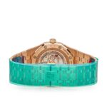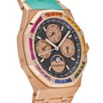 This is designed in a 41mm, 18-carat pink gold case and rainbow bezel set with 32 baguette-cut sapphires illuminate the black ??Grande Tapisserie?? dial of this limited edition of 20 pieces. It features the ‘Grande Tapisserie’ pattern on the blue dial equipped with four counters displaying the day, date, month, astronomical moon, week of the year and leap year indication. The watch is complimented by an 18-carat rose gold bracelet with AP folding-clasp.
