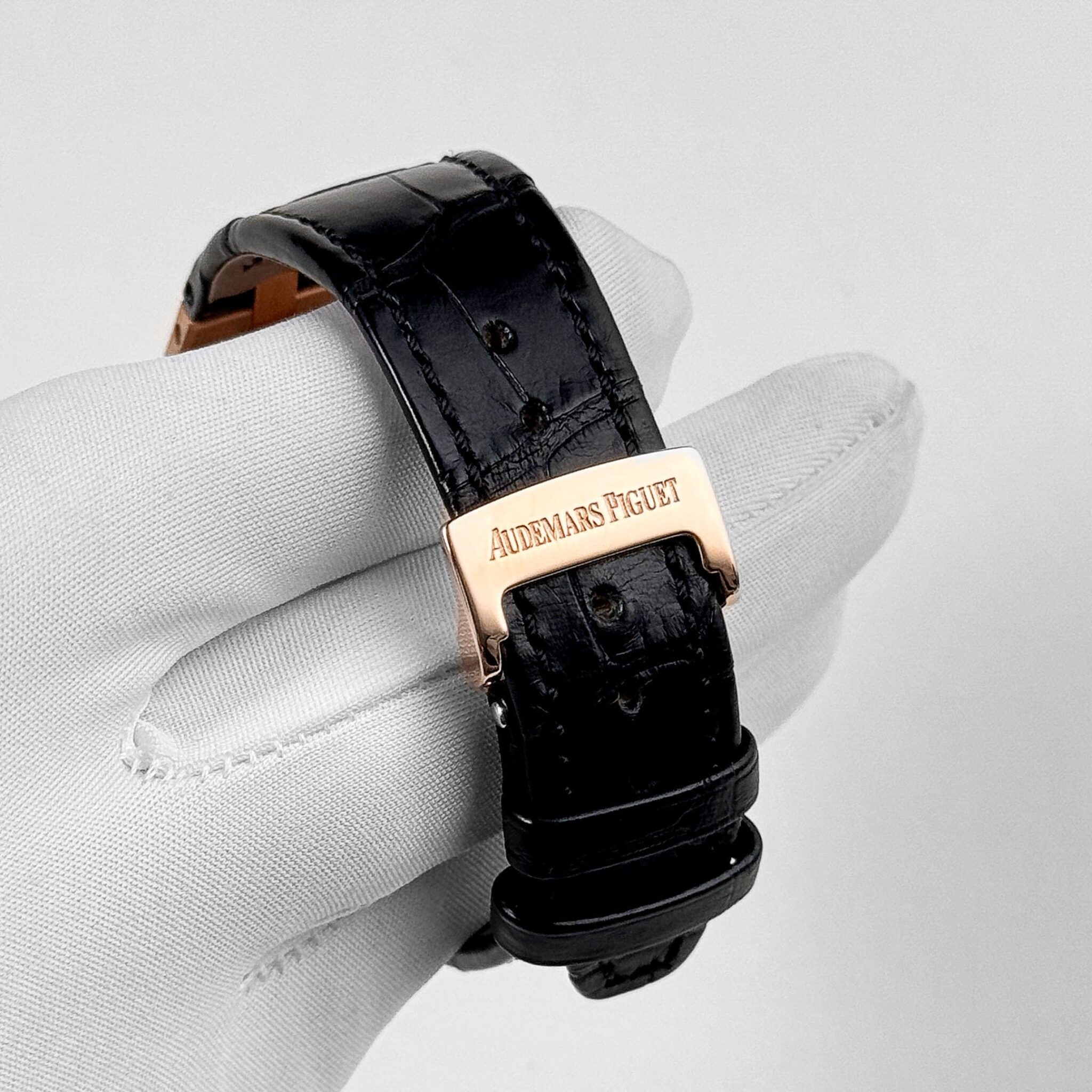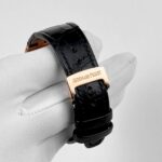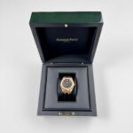 The Audemars Piguet Selfwinding is a stunning watch that features a 37mm case diameter and rose gold case material. The dial displays a black “Grande Tapisserie” pattern and it comes on a hand-stitched, large square scale, black alligator strap with 18-carat rose gold AP folding clasp.