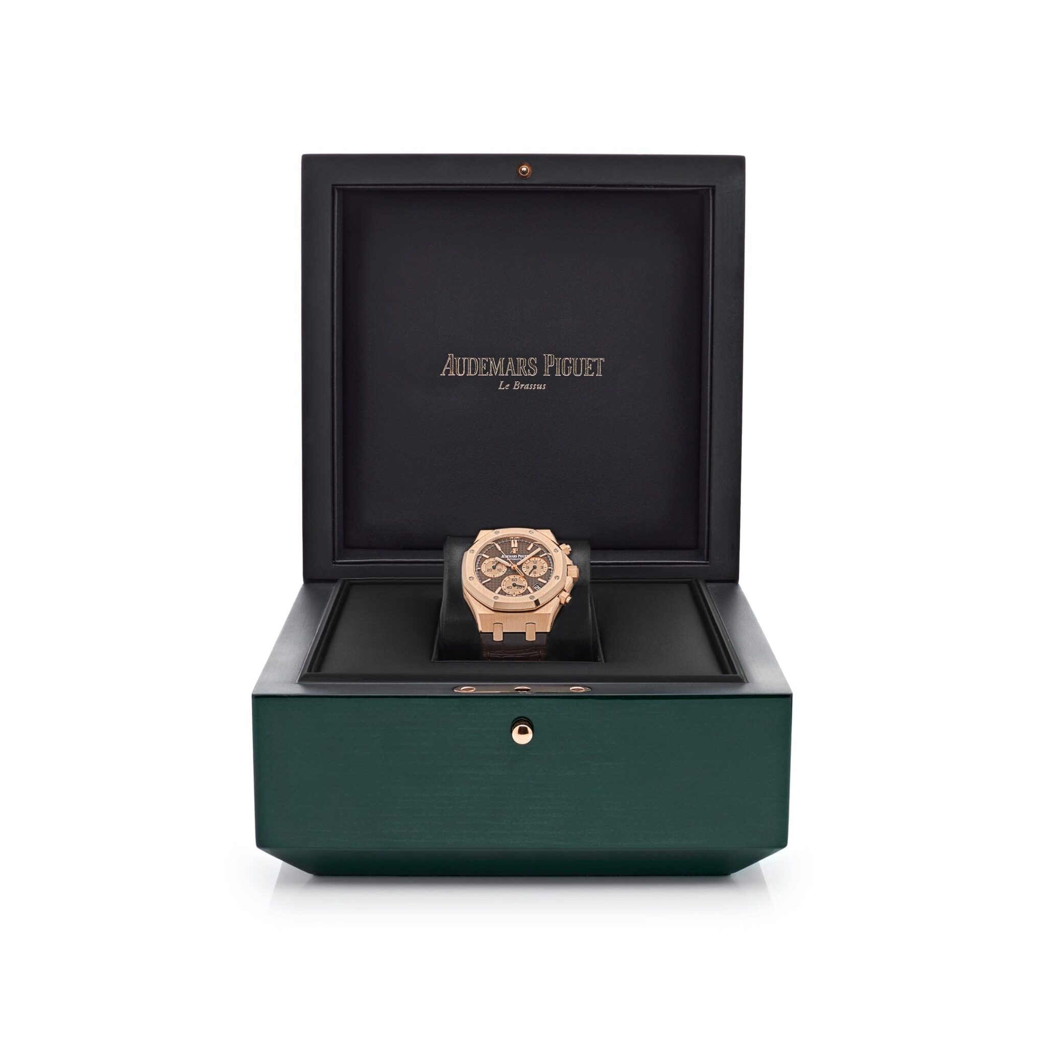 This Selfwinding adorns a brown ‘Grande Tapisserie’ dial with pink gold-toned counters, pink gold applied hour-markers and Royal Oak hands with luminescent coating. This model features a 41mm 18-carat pink gold case, glareproofed sapphire crystal and caseback, and screw-locked crown. It comes on a hand-stitched, large square scale, brown alligator strap with an 18-carat pink gold AP folding clasp.