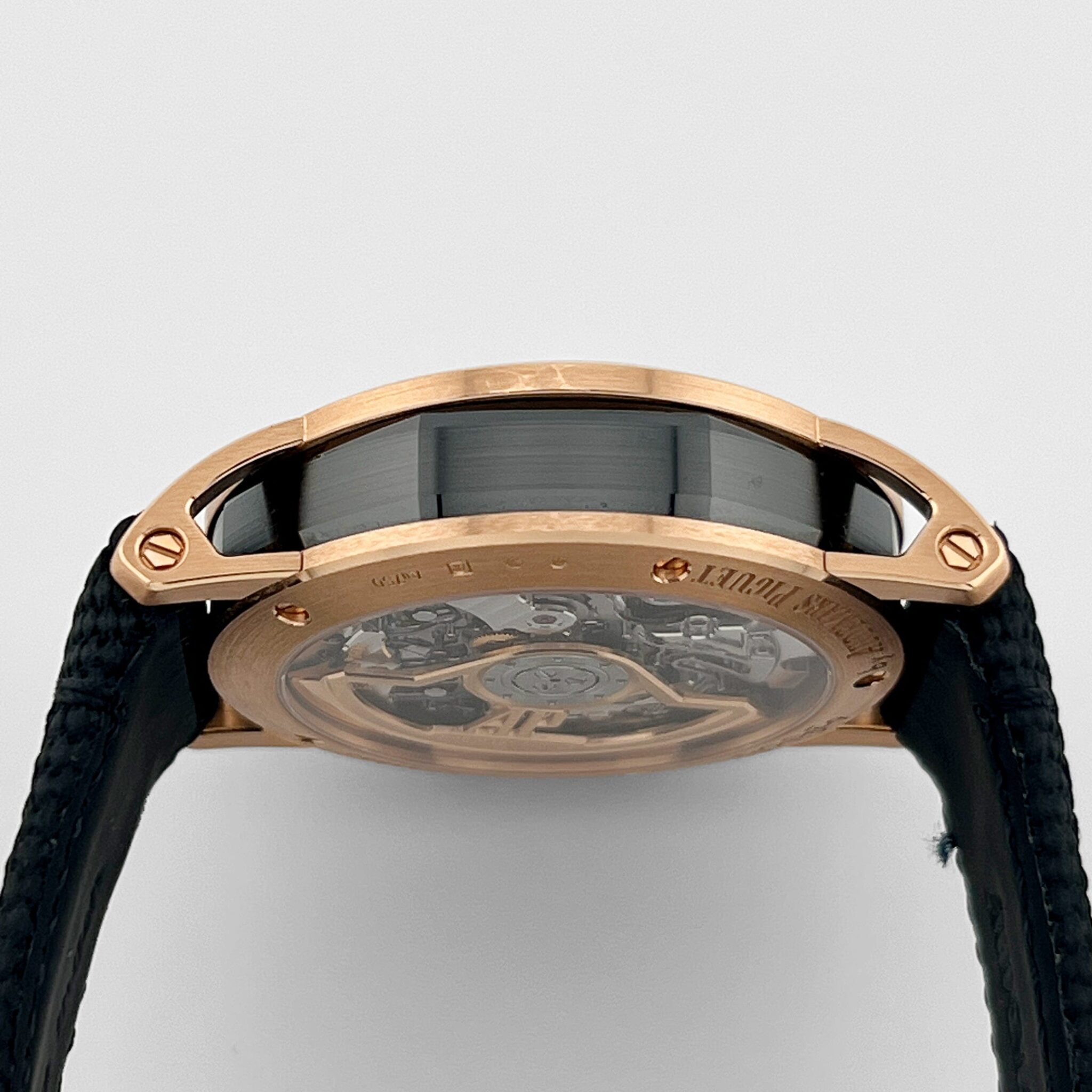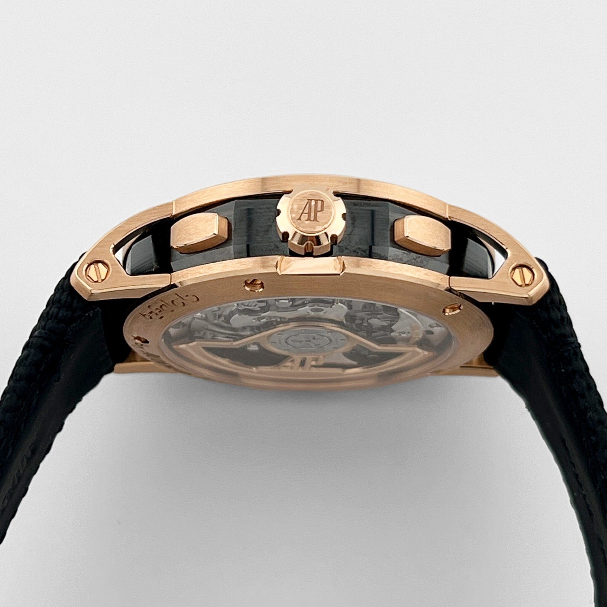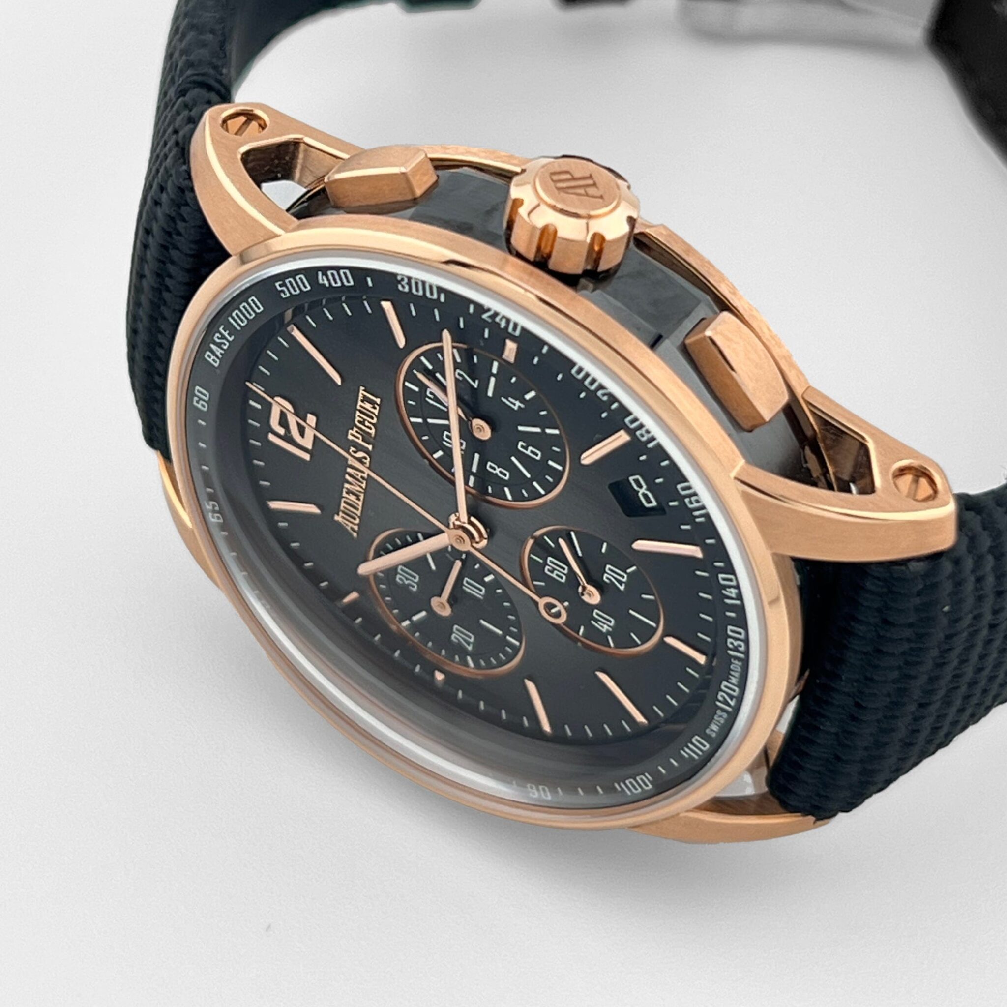 This Audemars Piguet ” is designed in a 41mm 18-carat rose gold and?black ceramic?case with a smooth round bezel. It features a lacquered smoked grey dialwith three sub-dials. Its chronograph functions include integrated column wheel chronograph mechanism and flyback function which allows instant restarting of the stopwatch without stopping and resetting. This watch is complimented by a blackrubber-coated strap with 18-carat pink gold pin buckle.