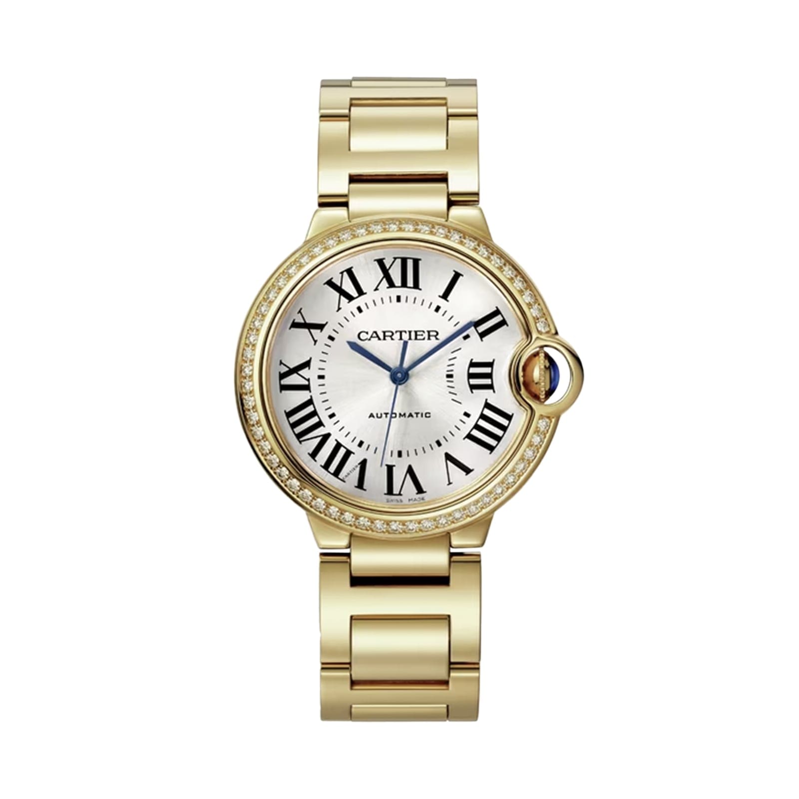 Ballon Bleu de Cartier watch, 36 mm, mechanical movement with automatic winding. Yellow gold 750/1000 case set with 54 brilliant- cut diamonds totaling 0.79 carat. Fluted crown set with a cabochon sapphire. Silver dial with sunray-effect. Blued-steel sword- shaped hands. Sapphire crystal. Yellow gold 750/1000 interchangeable bracelet. Thickness: 12.1 mm. Water-resistant up to 3 bar (approx. 30 meters/100 feet).