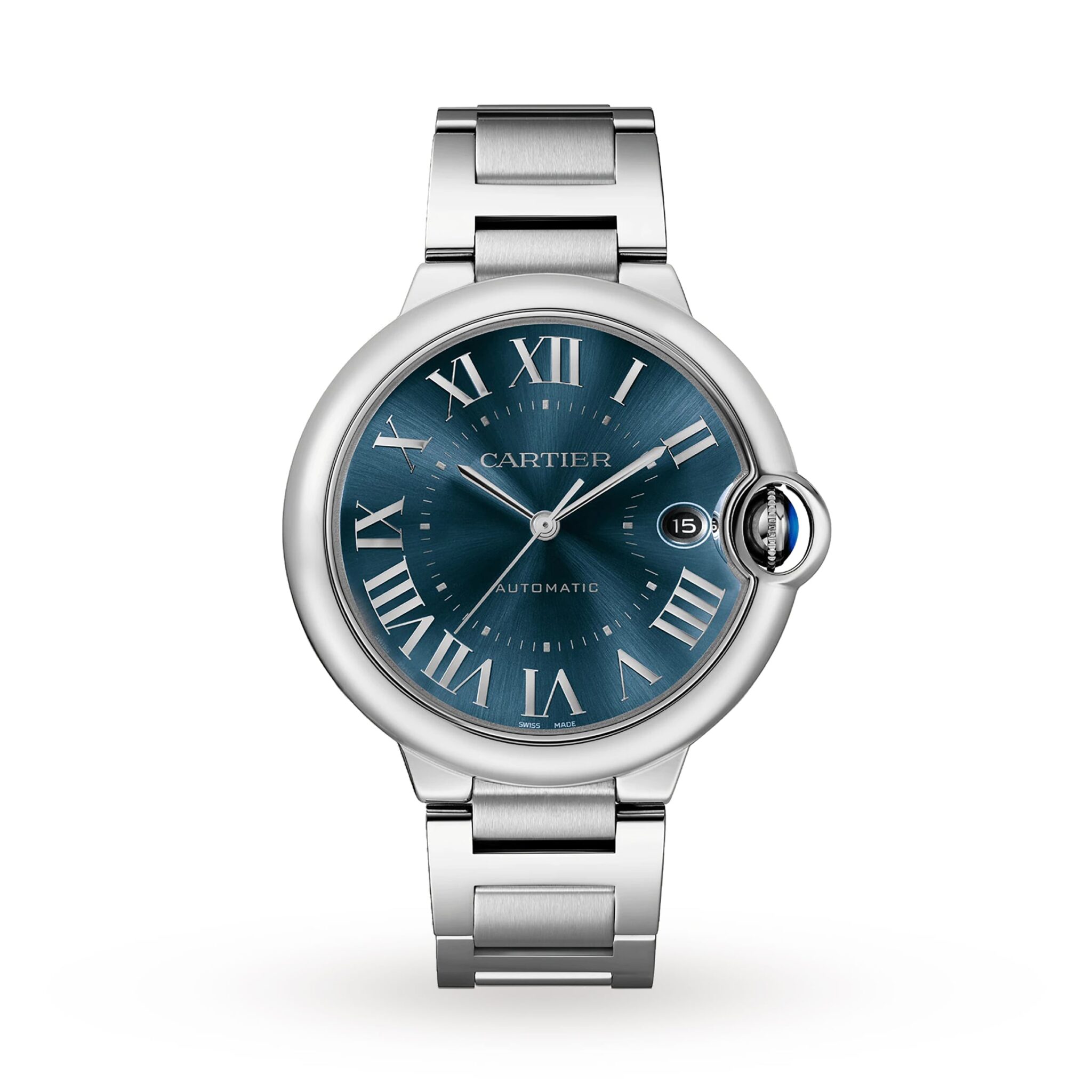 Ballon Bleu de Cartier watch, 40 mm, Manufacture mechanical movement with automatic winding, caliber 1847 MC. Steel case, fluted crown set with a synthetic cabochon-shaped spinel, blue sunray-brushed dial, silvered sword-shaped hands, sapphire crystal, interchangeable steel bracelet, calendar aperture at 3 o’clock. Thickness: 12.4 mm. Water-resistant up to 3 bar (approx. 30 meters/100 feet).