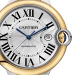 Ballon Bleu de Cartier – constantly seeking harmony Merging elegant lines with volumetric grace Sitting confidently in a 42mm case crafted from 18K yellow gold and steel Silvered guilloche dial with blued-steel sword-shaped hands and Roman numerals Powered with precision by Calibre 1847 MC automatic winding movement IN SEARCH OF HARMONY An unmistakeable Cartier collection, the Balloon Bleu de Cartier represents a quest for balance. Redefining circular form, its double-curved design achieves a beautiful interplay of shape and dimension. Each watch in the collection features a blue sapphire cabochon nestled within the seamlessly integrated winding crown, giving the appearance of a floating blue balloon. The crown is protected by a sleek metal arch at the three o’clock position, shielding the rich blue gem. ELEGANCE AND GRACE This 42mm timepiece features a sophisticated combination of 18K yellow gold and durable steel in both its case and bracelet, creating a striking contrast that exudes elegance and strength. Crafted in a meticulous 15 stage process, the silvered dial features an intricate guilloche finish, Roman numerals, a date display at 6 o’clock, and the collection’s signature blued-steel sword-shaped hands. The reliable Calibre 1847 MC self-winding mechanical movement with a 40-hour power reserve ensures flawless performance.