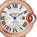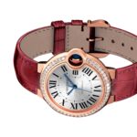 Ballon Bleu de Cartier watch, 33 mm, self-winding mechanical movement. Case in rose gold 750/1000 set with brilliant-cut diamonds. Fluted crown decorated with a sapphire cabochon. Silvered sunray-brushed dial. Blued-steel sword-shaped hands. Sapphire crystal. Burgundy alligator strap, ardillon buckle in rose gold 750/1000. Case thickness: 10 mm. Water-resistant to 3 bar (~30 metres).