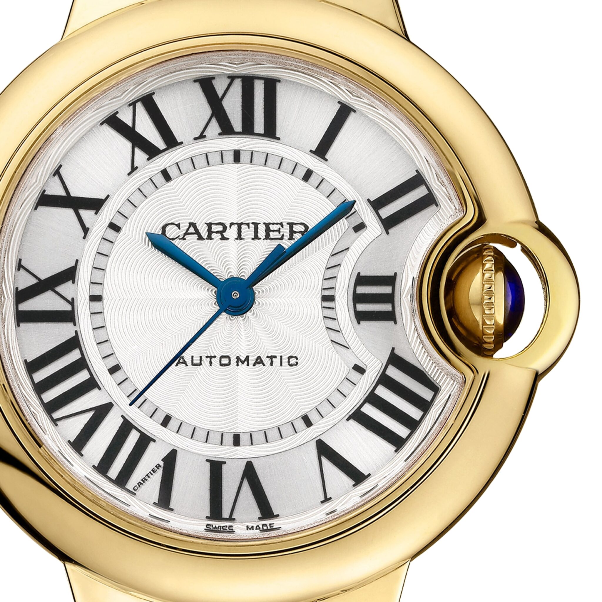 Ballon Bleu de Cartier watch, 33 mm, mechanical movement with automatic winding. Yellow gold 750/1000 case and fluted crown set with a sapphire cabochon. Silvered guilloch?? dial. Blued-steel sword-shaped hands. Sapphire crystal. Interchangeable yellow gold 750/1000 bracelet.10.16 mm thick. Water-resistant to 3 bar (approx. 30 metres).
