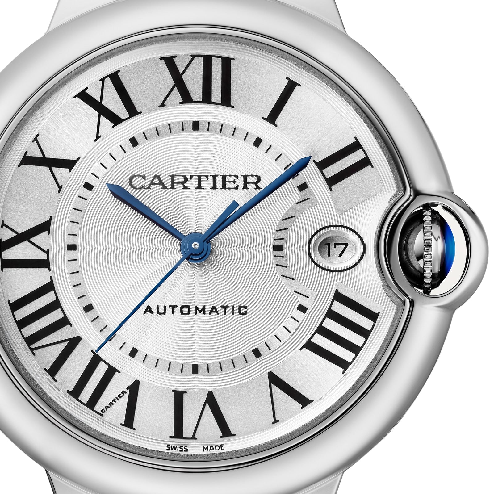 Ballon Bleu de Cartier watch, 40 mm, mechanical movement with automatic winding, calibre 1847 MC. Steel case, fluted crown set with a synthetic cabochon-shaped spinel, silvered guilloch?? dial, blued-steel sword-shaped hands, sapphire crystal, steel interchangeable bracelet, calendar aperture at 3 o’clock. Thickness: 12.4 mm. Water-resistant to 3 bar (approx. 30 metres).