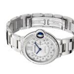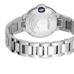 Ballon Bleu de Cartier – in pursuit of harmony Fluid lines and a distinct round shape Radiant sunray grey dial glistens with 21 brilliant cut diamonds totalling 0.10 carat Housed in a 33mm steel case secured with the collection’s iconic fluted steel crown Driven by a reliable self-winding movement with a 37-hour power reserve for longevity and precision HARMONIOUS DESIGN Launched in 2007, the Ballon Bleu de Cartier quickly earned iconic status. Its design, inspired by a new vision of roundness, perfectly combines clean lines and elegant curves, creating a sense of elegant harmony. Each model in the collection features a blue sapphire cabochon set within the seamlessly integrated winding crown, creating the appearance of a floating blue balloon, which gives the collection its name. GRACEFUL FLUIDITY This striking model is characterised by its elegant dial. The sunray grey finish and intriguing ray-like pattern are elevated by 21 glistening diamonds, gracefully sprinkled like raindrops. A bezel set with 54 diamonds totalling 0.78 carats adds further scintillation, while the 33mm case features the fluid lines and distinct round shape that the collection is known for. Powered with precision by a self-winding mechanical movement, this elegant watch benefits from a 37-hour power reserve and water resistance to 3 bar (30 metres). An interchangeable steel bracelet provides comfort on the wrist.