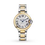 Ballon Bleu de Cartier – constantly seeking harmony Merging elegant lines with volumetric grace Housed in a 33mm case crafted from 18K yellow gold and steel Silvered guilloche dial with blued-steel sword-shaped hands Powered by mechanical movement with automatic winding ROUNDNESS REIMAGINED An unmistakeable Cartier collection, the Balloon Bleu de Cartier represents a quest for balance. Redefining circular form, its double-curved design achieves a beautiful interplay of shape and dimension. Each watch in the collection features a blue sapphire cabochon nestled within the seamlessly integrated winding crown, giving the appearance of a floating blue balloon. The crown is protected by a sleek metal arch at the three o’clock position, shielding the rich blue gem. ELEGANCE AND STRENGTH This 33mm timepiece features a sophisticated combination of 18K yellow gold and durable steel in both its case and bracelet, creating a striking contrast that exudes elegance and strength. Crafted in a meticulous 15 stage process, the silvered dial features an intricate guilloche finish, Roman numerals and the blued-steel sword-shaped hands that have become characteristic of the collection. A reliable self-winding mechanical movement with a 37-hour power reserve ensures flawless performance.