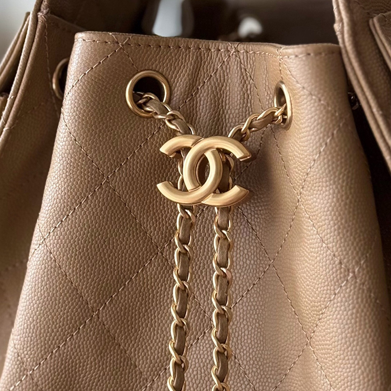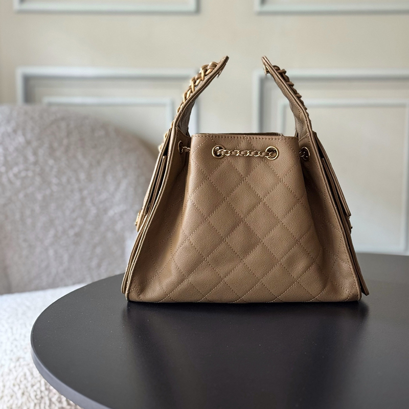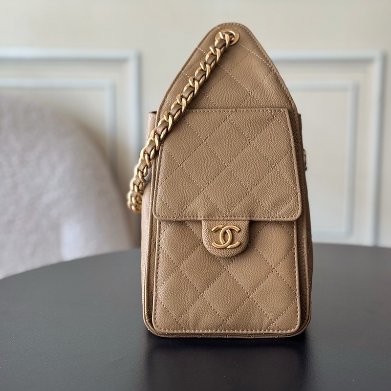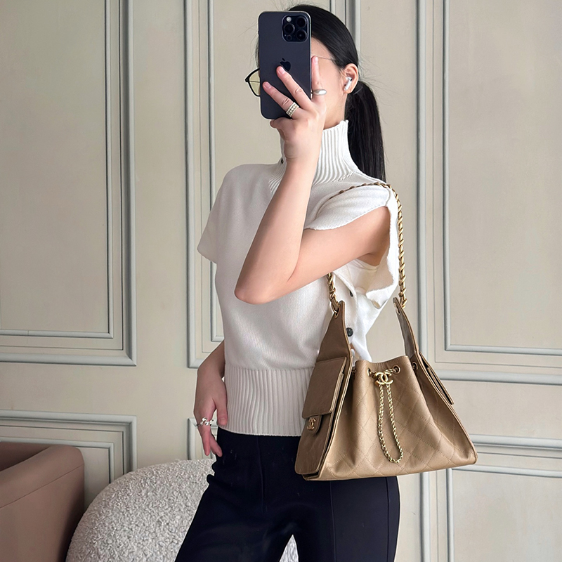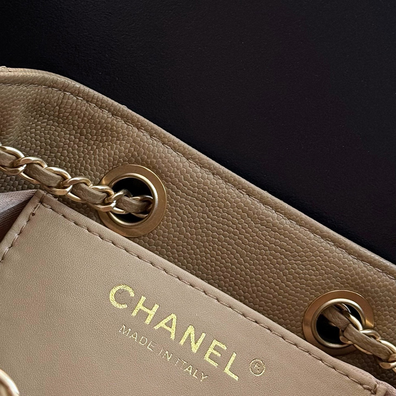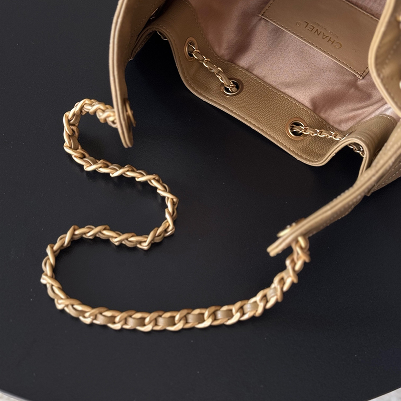 The CHANEL 25 bag reinterprets a house icon with a contemporary attitude, defined by its signature drawstring closure and practical side pockets. The small size offers the perfect balance of casual shape and everyday utility.