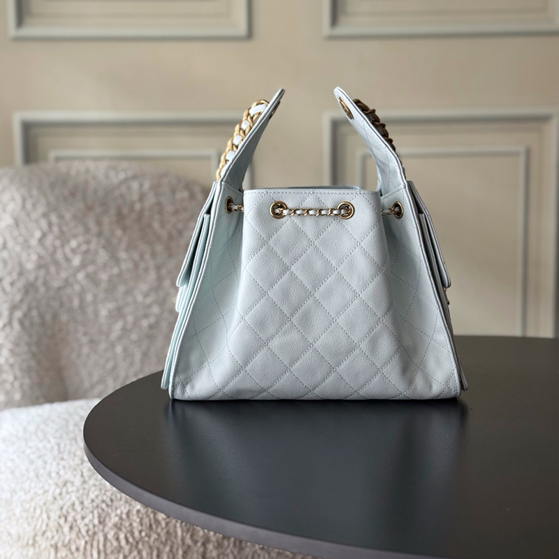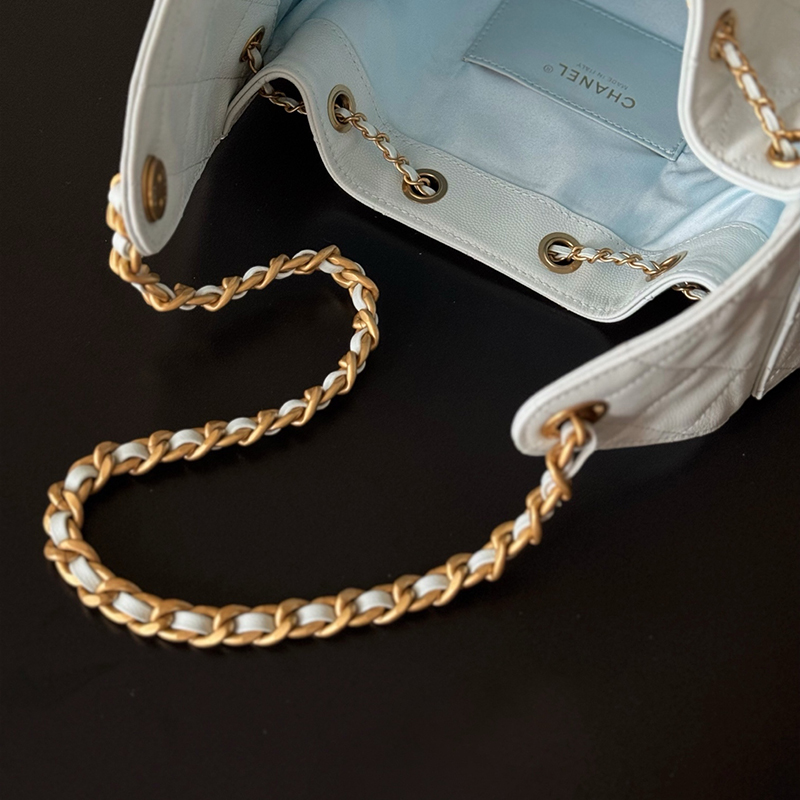 The CHANEL 25 bag reinterprets a house icon with a contemporary attitude, defined by its signature drawstring closure and practical side pockets. The small size offers the perfect balance of casual shape and everyday utility.