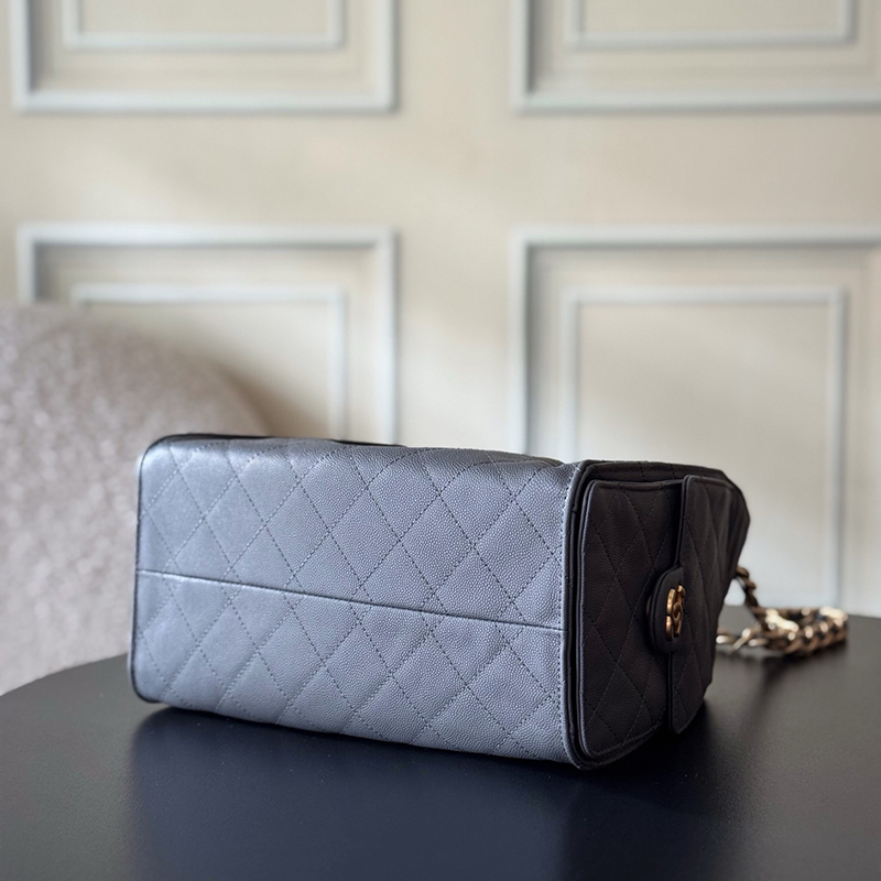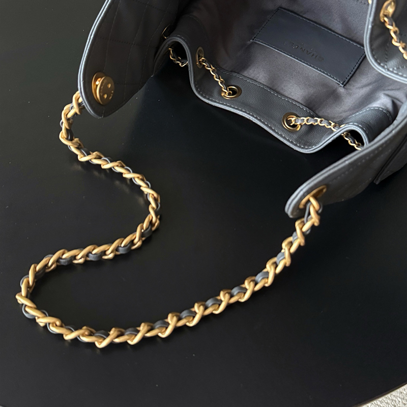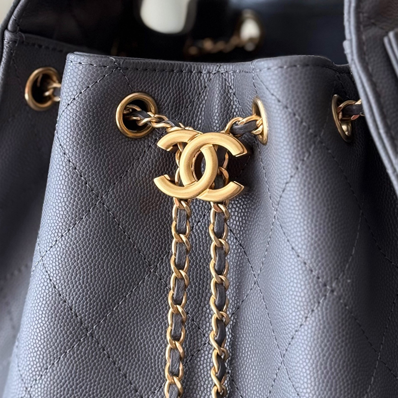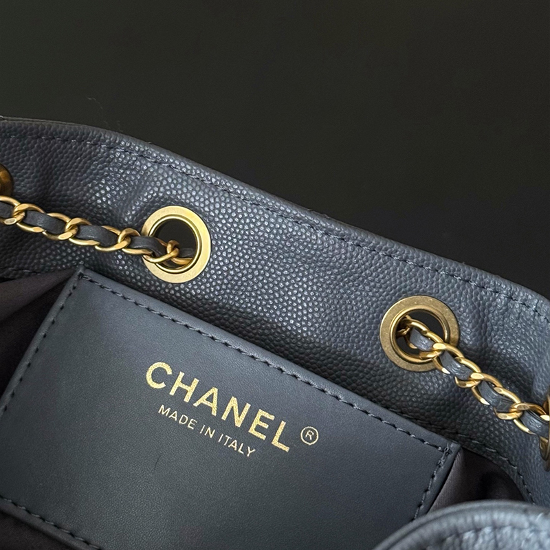The CHANEL 25 bag reinterprets a house icon with a contemporary attitude, defined by its signature drawstring closure and practical side pockets. The small size offers the perfect balance of casual shape and everyday utility.