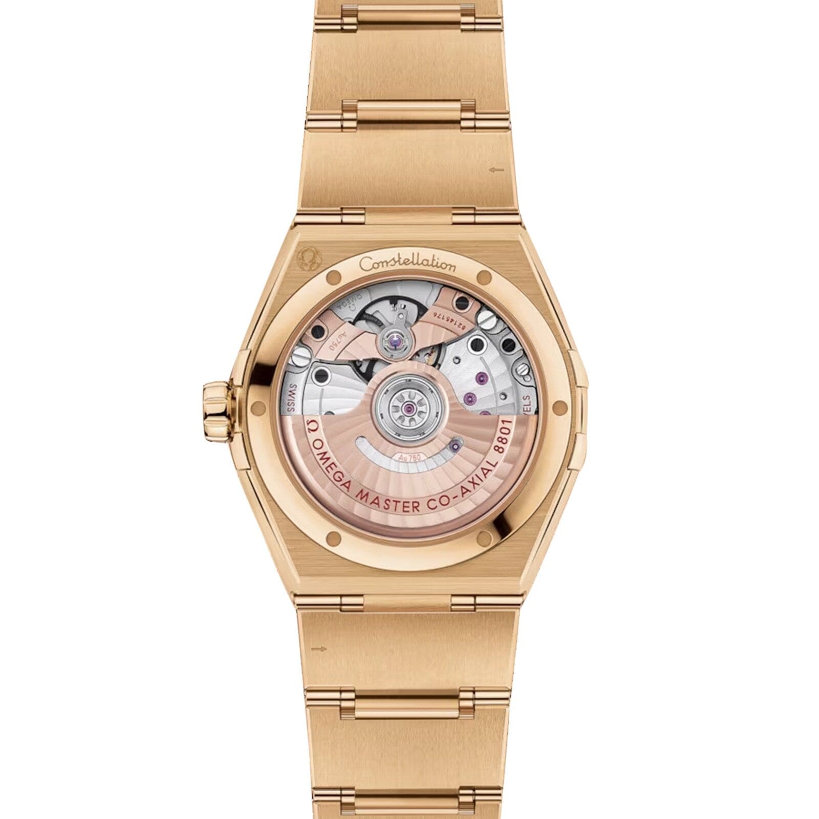 The dramatic and enduring design of the OMEGA Constellation is characterised by its famous half-moons, ??claws?? on the case and mono- rang bracelet. This 36 mm 18K yellow gold model features a bezel engraved with Roman numerals, a sun-brushed champagne dial and a date window at the 6 o’clock position. The hands, OMEGA logo, Constellation star and indexes are all in 18K yellow gold. At the heart of this timepiece is the OMEGA Co-Axial Master Chronometer Calibre 8801, visible through the domed scratch-resistant sapphire crystal.
