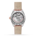 Design elements inspired by luxury sailboats Marquise-cut diamond hour markers Reliability and precision of OMEGA’s Master Chronometer 34mm stainless steel and 18K Sedna? gold ladies watch with crystal linen dial An elegant tribute to OMEGA??s rich maritime heritage OCEAN-GOING ELEGANCE The Seamaster Aqua Terra is a new chapter in the illustrious ocean-going heritage of OMEGA, an everyday take on the classic Seamaster design that can be worn in any context – just as comfortable swimming or diving as it is worn on more formal occasions. This elegant ladies timepiece is enhanced with several luxurious design touches, including a nude wave-embossed dial with complementary 18k Sedna? gold hands and 11 marquise-cut diamonds as hour markers. The sporty practicality of this range is maintained with the 150m water resistance and 5 year OMEGA guarantee. The Aqua Terra model was one of the first timepieces to be powered by OMEGA??s revolutionary Co-axial escapement, so this range is naturally fitted with the latest Master Chronometer, the calibre 8800. This METAS certified automatic movement is rated to resist magnetic fields up to 15000 gauss, with the additional benefit of needing far less regular servicing than a typical automatic movement. PREMIUM MATERIALS This 34mm model features a dial colour that matches the 18K Sedna? gold bezel and leather strap, with a date window at 6H. Complementing this are the 18K Sedna? crown and hands filled with white Super-LumiNova, as well as the 11 diamond hour markers. In traditional Seamaster style, the wave-edged caseback houses a sapphire crystal for viewing OMEGA’s ultra-precise calibre 8802 movement.