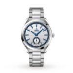 A tribute to Omega??s rich maritime heritage A Master Chronometer certified by METAS Water resistant to 15 bar (150 metres) Featuring 8916 calibre movement 41mm stainless steel case presented on a stainless steel bracelet TECHNICAL SOPHISTICATION WITH OCEAN SPIRIT A tribute to Omega??s rich maritime heritage, the Seamaster Aqua Terra collection balances technical sophistication and ocean spirit. The 150m models offer a refreshing new look, with clean aesthetics, a new symmetrical case design, and Master Chronometer movements with extraordinary levels of magnetic resistance. These timepieces are further characterised by a patterned dial, inspired by the wooden decks of luxury boats. LUXURY MODEL A Master Chronometer certified by METAS, this 41mm model is set in a stainless steel case, paired with a co-ordinating bracelet. The blue and silver-toned dial features a blue hands and indexes, a small seconds sub-dial and a date window at 6 o??clock. A transparent caseback with a wave-edged design reveals the 8916 calibre movement in action as it powers this timepiece with reliability. Introducing superior precision, water resistance to 150 metres, shock resistance and 60 hours of power reserve, the Seamaster Aqua Terra 150m is a luxury model venturing into new territory.