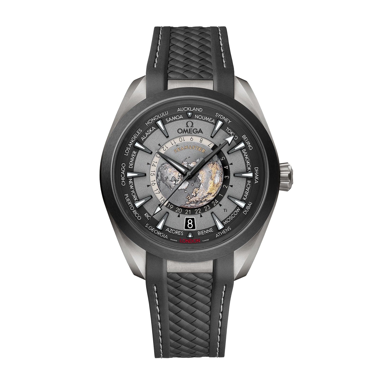 Seamaster Aqua Terra – a tribute to Omega’s rich maritime legacy Keep track of time anywhere in the world Presented in a 43mm brushed titanium case paired with an integrated black structured rubber strap Black and grey dial with a vision of the Earth viewed from above the North Pole Water resistant to 15 bar (150 metres) TOUR THE WORLD Keep track of time wherever you are in the world with the Omega Seamaster Aqua Terra Worldtimer collection. This unique collection presents the teak-patterned dials seen elsewhere in the Aqua Terra collection, with the addition of a truly global influence. International destinations are listed around the dial and its outer ring, including the brand’s hometown of Bienne, Switzerland. At the very heart of the dial, the planet Earth is depicted via a cutting-edge view of the continents, achieved with advanced laser-ablation technology on a Grade 5 titanium plate. KEEP TRACK OF TIME AROUND THE GLOBE This 43mm timepiece features a brushed grade 2 titanium case paired with an integrated black structured rubber strap with grey stitching and a polished-brushed foldover clasp. The impressive black and grey dial features blackened hands and indexes, and a circle of global destinations. At the centre of the dial sits a 24-hour, glass ring, divided into day and night sections. This international chronograph is powered by a Co-Axial Master Chronometer 8938 calibre movement for the ultimate precision, wherever you are in the world.