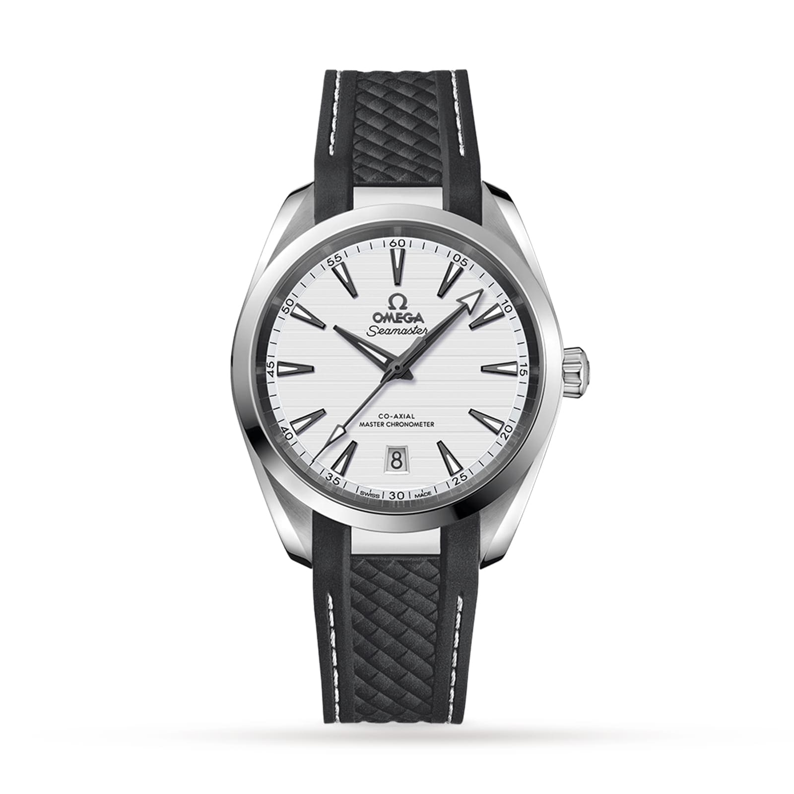 A tribute to Omega??s rich maritime legacy Seamaster heritage with the 8800 calibre movement Water resistant to 15 bar (150 metres) 38mm stainless steel case paired with a grey, structured rubber strap Master chronometer certified by METAS INSPIRED BY LUXURY SAILBOATS A tribute to Omega??s rich maritime heritage, the Seamaster Aqua Terra collection balances technical sophistication and ocean spirit. The 150m models offer a refreshing new look, with clean aesthetics, a new symmetrical case design, and Master Chronometer movements with extraordinary levels of magnetic resistance. These timepieces are further characterised by a patterned dial, inspired by the wooden decks of luxury boats. OUTSTANDING TECHNICAL ABILITY This 38mm watch features a classic stainless steel case, paired with a grey, structured rubber strap with contrasting white stitching. The silver-toned dial features a horizontal teak pattern, a date window at 6 o’clock, and blackened hands and indexes filled with white Super-LumiNova for enhanced visibility. The 8800 calibre movement delivers incredible precision, on land and at sea.