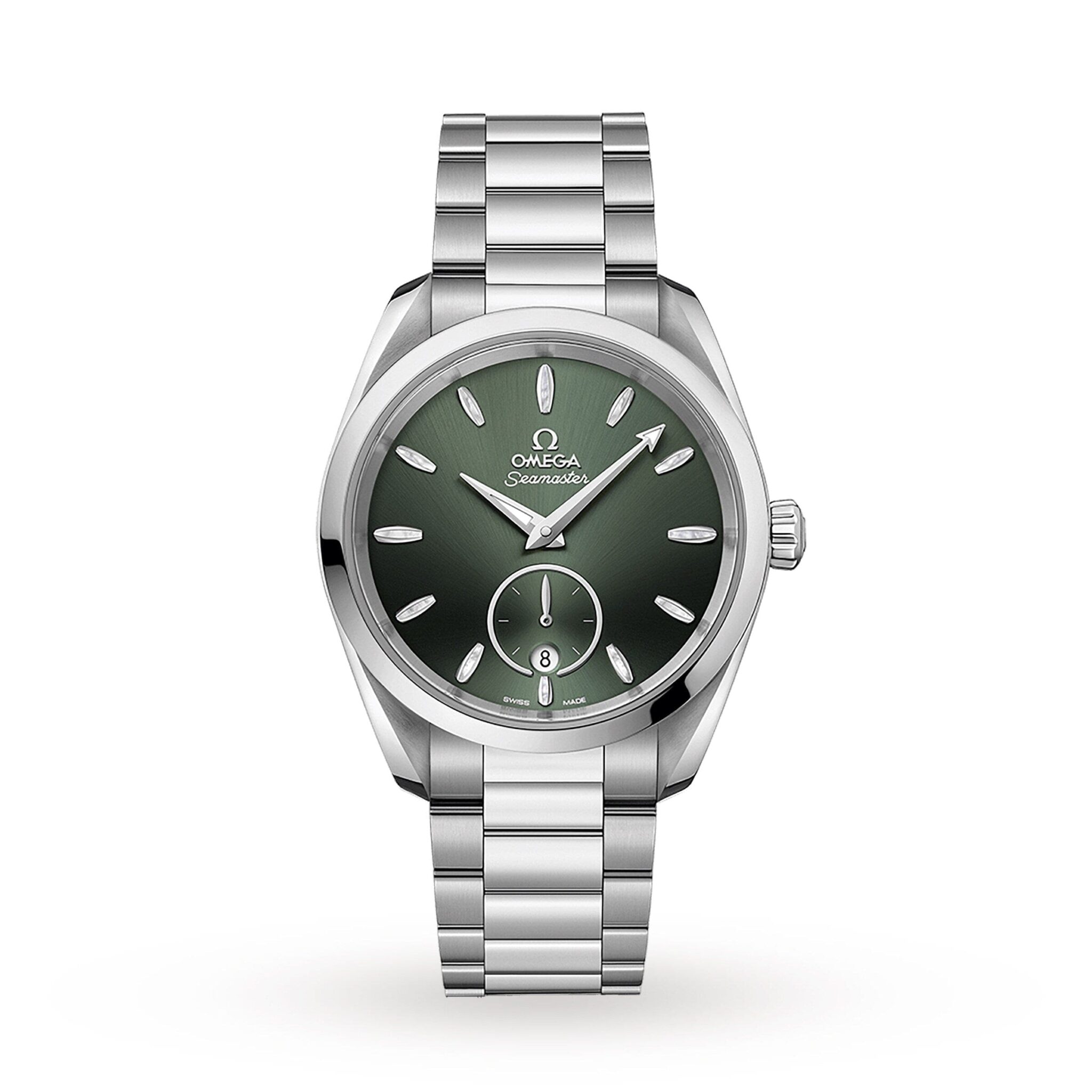 A stunning tribute to Omega??s rich maritime heritage Seamaster heritage with 8802 calibre movement Water resistant to 15 bar (150 metres) 38mm stainless steel case paired with a shimmering leather strap Master chronometer certified by METAS OCEAN HERITAGE A tribute to Omega??s rich maritime heritage, the Seamaster Aqua Terra collection balances technical sophistication and ocean spirit. The 150m Small Seconds models are notably stylish with captivating dials in rich shades, shimmering finishes, and glistening diamond details. LUXURIOUS DETAILS This charming 38mm timepiece features a symmetrical, stainless steel case paired with a co- ordinating stainless steel bracelet. The sun-brushed, dark green dial features a date window at 6 o??clock, an 18K white gold, small seconds sub-dial, and beautiful 18K white gold indexes shaped like the hulls of sailboats, with an iridescent mother-of-pearl inlay. This elegant chronograph is driven by the 8802 calibre movement for flawless precision.