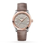 A stunning tribute to Omega??s rich maritime heritage Seamaster heritage with 8800 calibre movement Water resistant to 15 bar (150 metres) 34mm stainless steel and 18K Sedna? gold case paired with taupe-brown leather strap Master chronometer certified by METAS THE DEFINITION OF ELEGANCE A tribute to Omega??s rich maritime legacy, the Seamaster Aqua Terra collection balances technical sophistication and ocean spirit. The 150m models are notably stylish with captivating dials in rich shades, shimmering finishes, and glistening diamond details. LUXURIOUS TONES This beautiful 34mm chronograph features a symmetrical, stainless steel and 18K Sedna? gold case, paired with taupe-brown leather strap. The glistening grey dial glistens features a waved pattern, a date window at 6 o??clock, and 18K Sedna? gold indexes shaped like the hulls of sailboats. Power and precision are delivered by the powerful 8800 calibre movement.