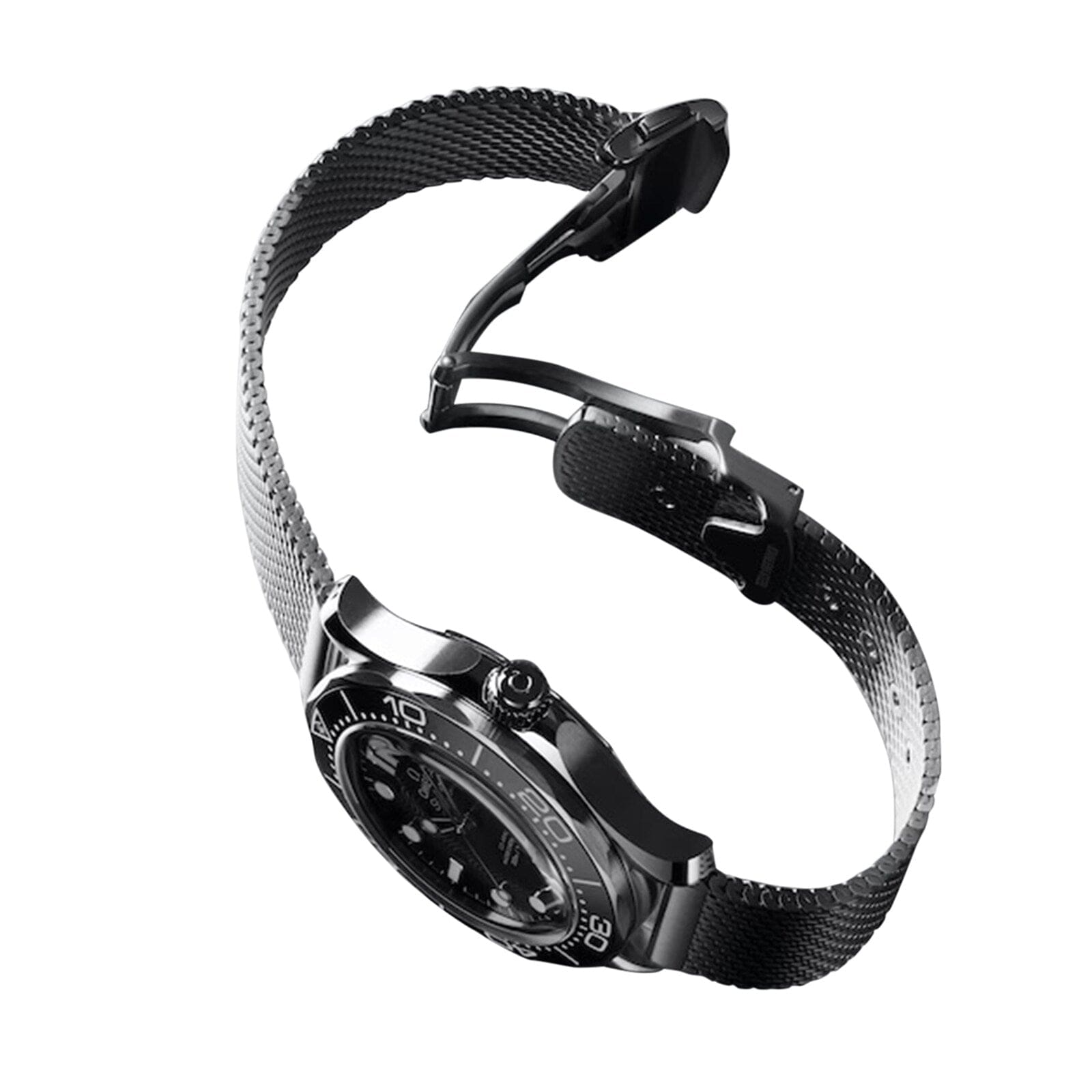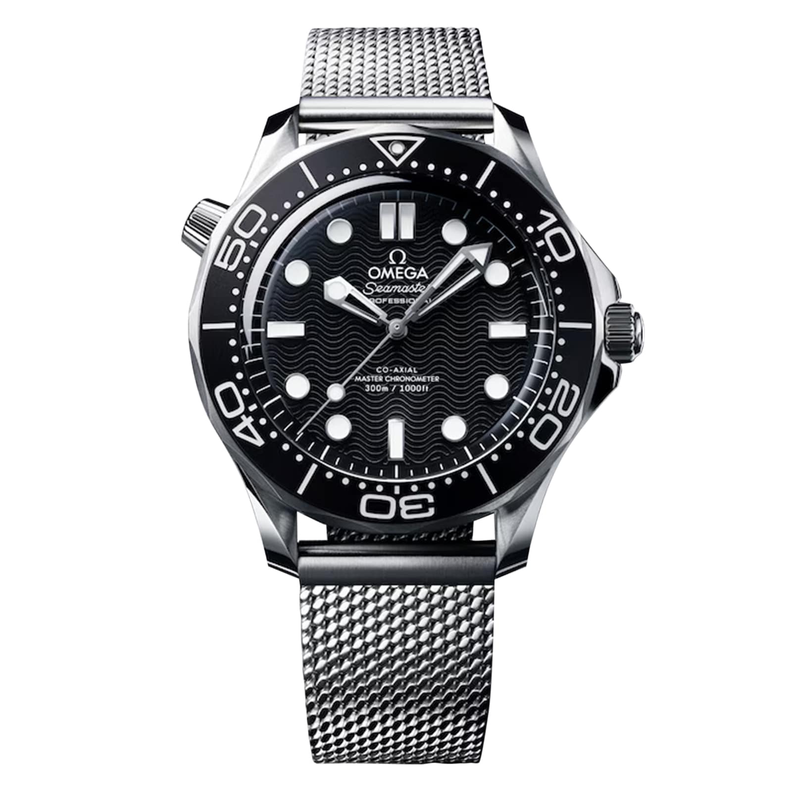 Since 1993, the Seamaster Diver 300M has enjoyed a legendary following. Today??s modern collection has embraced that famous ocean heritage and updated it with OMEGA??s most advanced innovation and design. This 42 mm model is crafted in stainless steel and includes a black oxalic anodized aluminium bezel ring with a diving scale in white Super-LumiNova. Black aluminium is also used to create the dial, which is laser-engraved with the Diver??s iconic wave pattern. The skeletonized hands and indexes are rhodium plated and filled with white Super-LumiNova, while the other markings, including the OMEGA logo, are transferred in white. The watch is presented on a brushed mesh bracelet with clasp, and is driven by the OMEGA Co-Axial Master Chronometer Calibre 8806, which can be seen through the sapphire-crystal caseback.