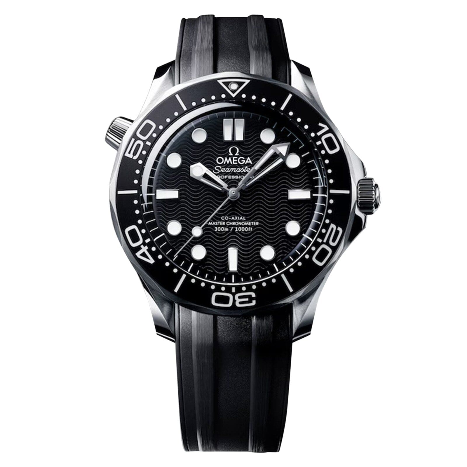 Since 1993, the Seamaster Diver 300M has enjoyed a legendary following. Today??s modern collection has embraced that famous ocean heritage and updated it with OMEGA??s most advanced innovation and design. This 42 mm model is crafted in stainless steel and includes a black oxalic anodized aluminium bezel ring with a diving scale in white Super-LumiNova. Black aluminium is also used to create the dial, which is laser-engraved with the Diver??s iconic wave pattern. The skeletonized hands and indexes are rhodium plated and filled with white Super-LumiNova, while the other markings, including the OMEGA logo, are transferred in white. The watch is presented on an integrated black rubber strap with foldover clasp, and is driven by the OMEGA Co-Axial Master Chronometer Calibre 8806, which can be seen through the sapphire-crystal caseback.