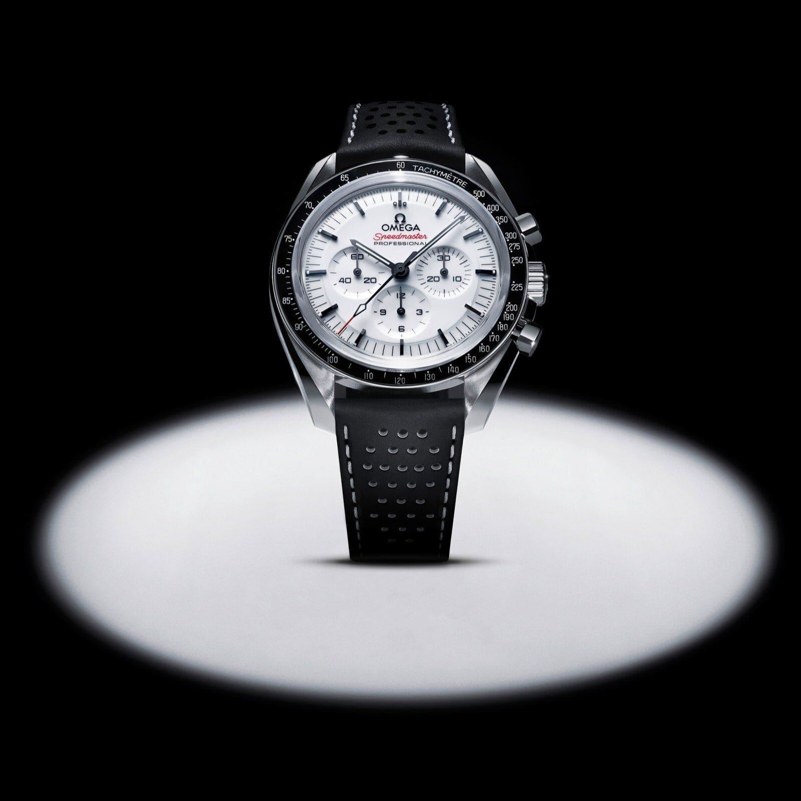 The Speedmaster Moonwatch is one of the world??s most iconic timepieces. Having been a part of all six moon landings, the legendary chronograph is an impressive representation of the brand??s adventurous pioneering spirit. Presented on a black micro-perforated leather strap with red and white stitching, this 42 mm Moonwatch in stainless steel features sapphire crystal glass on the front as well as on the caseback. Inspired by the 4th generation Speedmaster style worn on the moon, it also includes an asymmetrical case, a white lacquered step dial with applied OMEGA logo and indexes, Moonwatch style hands, and the famous dot over 90 on the black anodised aluminium bezel ring. The watch is driven by the OMEGA Co-Axial Master Chronometer Calibre 3861, which powers the small seconds sub-dial, 30-minute recorder and 12-hour recorder, along with the central chronograph function.