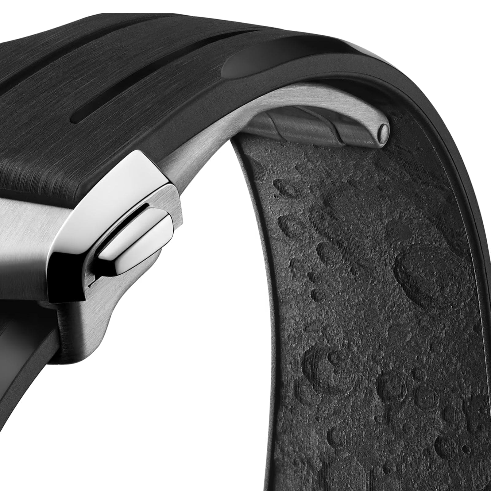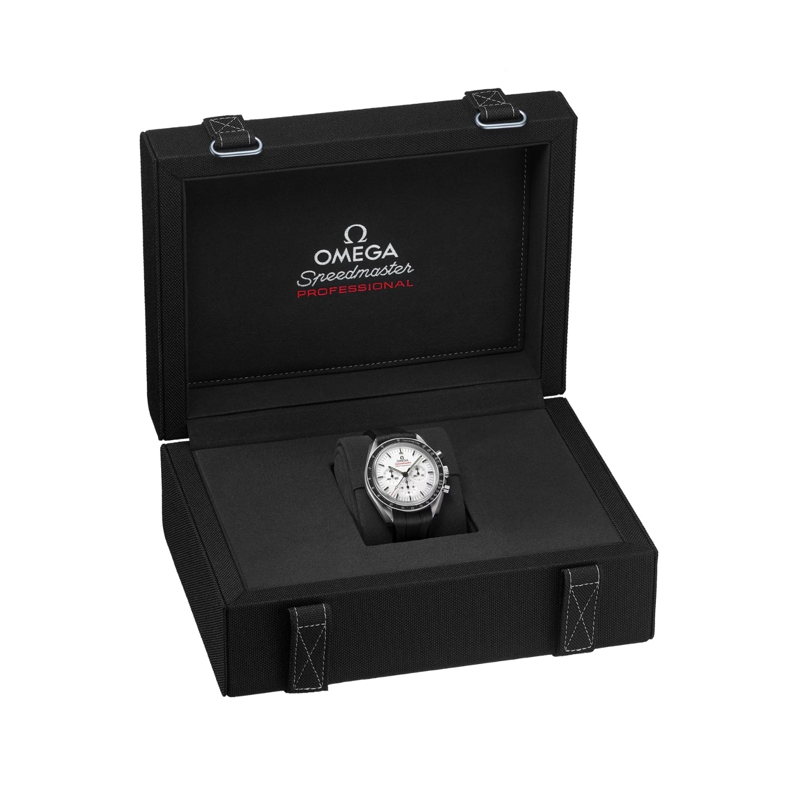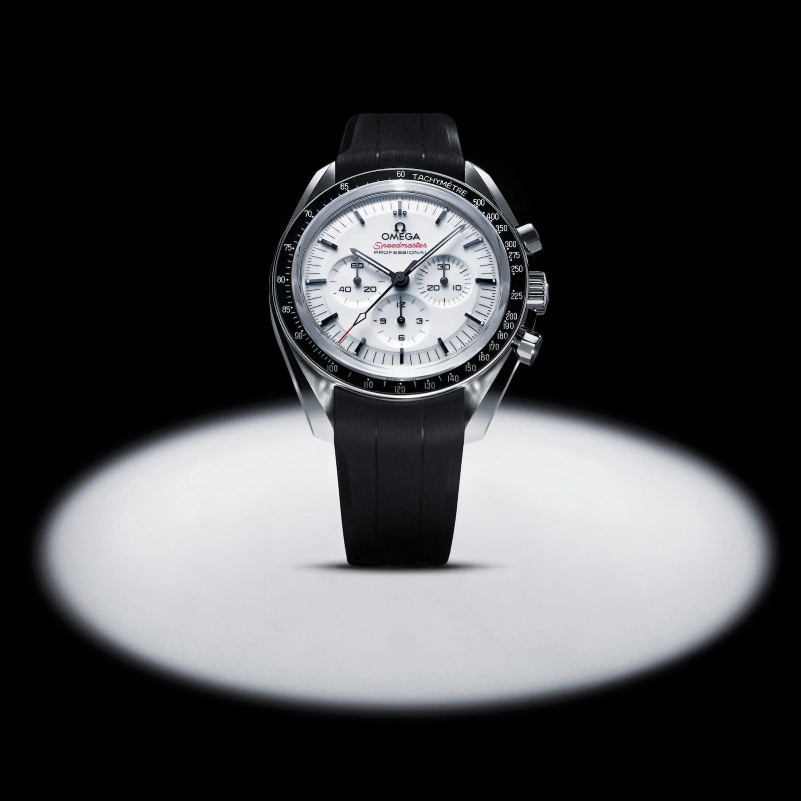 The Speedmaster Moonwatch is one of the world??s most iconic timepieces. Having been a part of all six moon landings, the legendary chronograph is an impressive representation of the brand??s adventurous pioneering spirit. This 42 mm Moonwatch in stainless steel features sapphire crystal glass on the front as well as on the caseback. Inspired by the 4th generation Speedmaster style worn on the moon, it also includes an asymmetrical case, a white lacquered step dial with applied OMEGA logo and indexes, Moonwatch style hands, and the famous dot over 90 on the black anodised aluminium bezel ring. The watch is presented on an integrated black rubber strap with a lunar surface pattern in positive relief on its underside. OMEGA’s famous Co-Axial Master Chronometer Calibre 3861 powers the small seconds sub-dial, 30-minute recorder and 12-hour recorder, along with the central chronograph function.