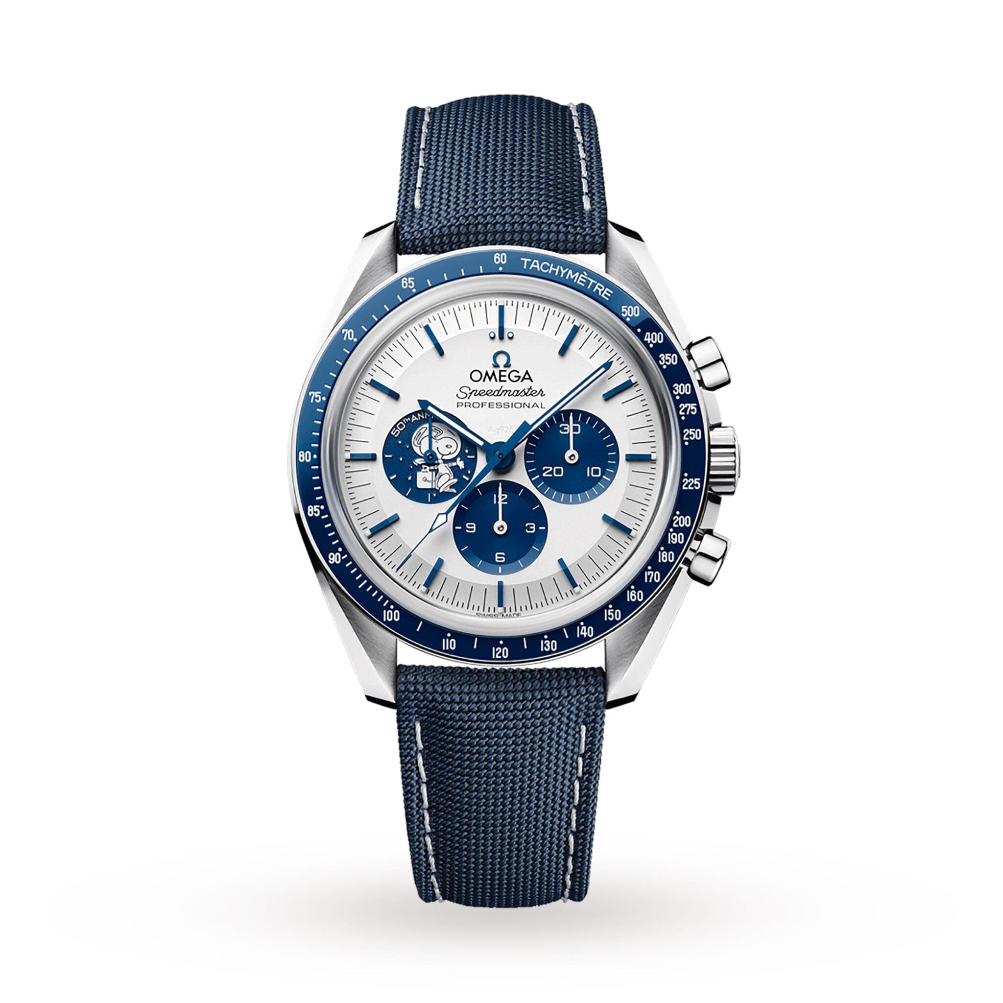 Marking the 50th anniversary of the Silver Snoopy Award Unique caseback featuring an animated Snoopy in his Command and Service Module Speedmaster heritage powered by the 3861 calibre movement 42mm stainless steel case paired with a blue nylon strap OMEGA Master Chronometers are officially certified by METAS MARKING 50 YEARS SINCE OMEGA RECEIVED THE SILVER SNOOPY AWARD Famed as the first watch on the moon and having been part of all six lunar missions , the legendary Speedmaster family represents Omega??s adventurous and pioneering spirit. This unique model pays celebrates 50 years since NASA awarded OMEGA the Silver Snoopy Award, in honour of the brand??s contributions to space exploration. NEW REALMS OF DESIGN This 42mm timepiece pairs a stainless steel case with a blue nylon strap, featuring the trajectory of the Apollo 12 mission on the embossed lining. The silver-toned dial features blue PVD hour markers and hands, as well as three blue sub-dials. On the 9 o??clock sub-dial, Snoopy appears as an embossed, silver medallion. But the caseback that really defines this statement watch. The sapphire crystal has been decorated with an image of the far side of the moon, while an animated Snoopy in his Command and Service Module is shown on a magic hand. When the chronograph function is in use, the magic hand moves, creating the impression that Snoopy is flying through space. An Earth disc sits behind, rotating once per minute in sync with the small seconds hand. Confidently driven by the 3861 calibre movement, this timepiece is a worthy reminder of the brand??s achievements, on earth and beyond.