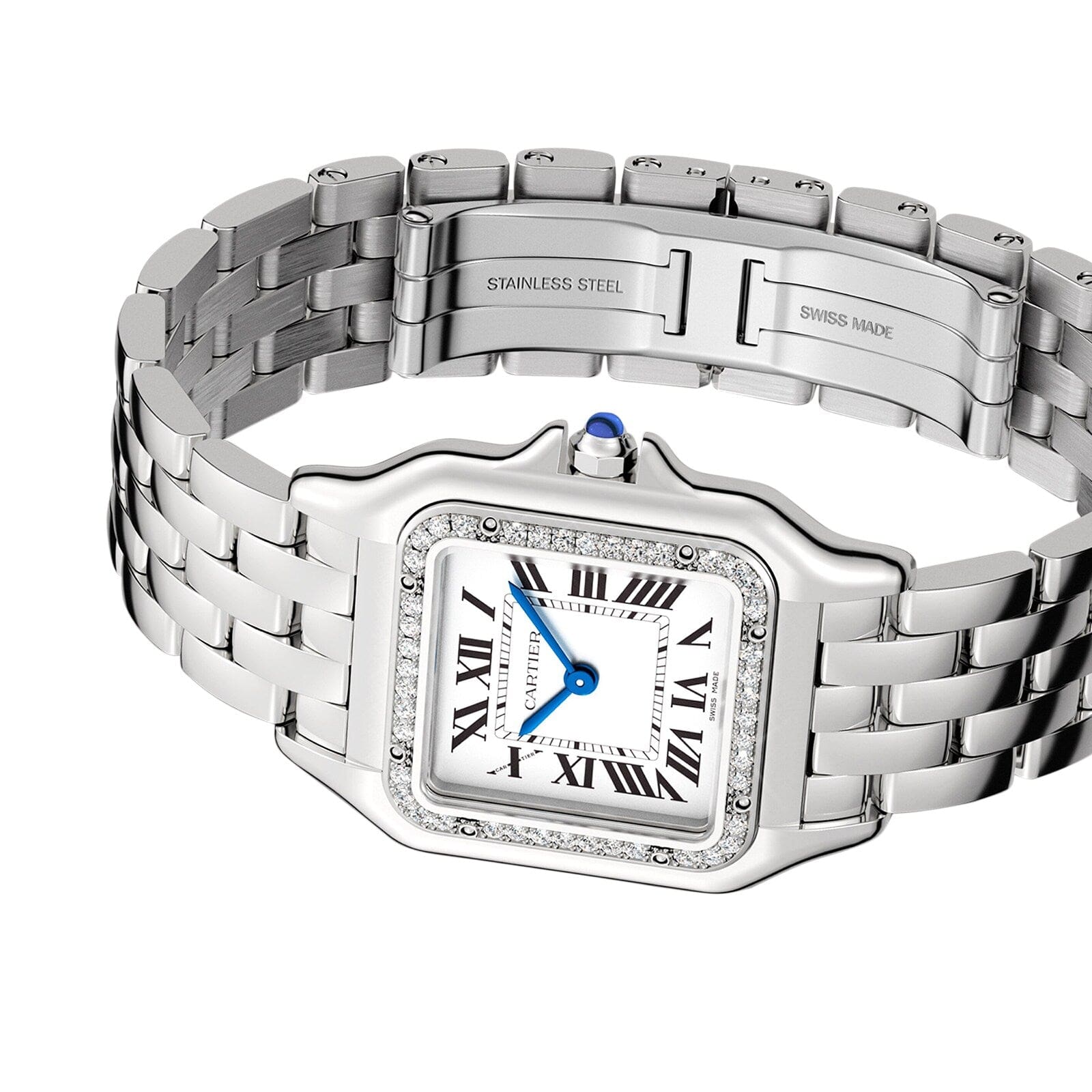 Panth??re de Cartier – a quintessential jewellery watch Impeccably crafted with soft clean lines that give a sense of gentle fluidity Housed in a 29 x 37mm steel case set with brilliant cut diamonds for sophisticated radiance Silvered dial with signature blued-steel sword-shaped hands Finished with a flexible steel bracelet that echoes the graceful movement of the panther A NOD TO 1980S GLAMOUR Embodying the charm of the 1980s, the Panth??re de Cartier is eternally stylish and truly iconic. Inspired by the bold design trends of the decade, the collection is characterised by the ultra-flexible bracelet, inspired by the agile movements the Maison’s emblematic animal – the panther. STRENGTH AND AGILITY Effortlessly elegant, this iconic watch captures Cartier’s daring spirit. With gently rounded edges, the 29mm x 37mm steel case emphasises the model’s sophisticated allure. Framed by radiant brilliant cut diamonds, the silvered dial retains the brand’s iconic aesthetic with blued-steel sword-shaped hands and classic Roman numerals. Driven by dependable Quartz movement, this model is water resistant to 3 bar (30 metres) and fastens securely with an agile steel bracelet.