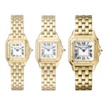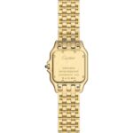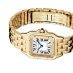 Panth??re de Cartier watch, medium model, quartz movement. Case in 18K yellow gold, dimensions: 27 mm x 37 mm, thickness: 6 mm, crown set with a blue sapphire, silvered dial, blued-steel sword-shaped hands, 18K yellow gold bracelet, water-resistant to 3 bar (around 30 metres). At once a watch and jewel, the Panth??re de Cartier timepiece is one of the most distinctive Cartier designs. Born in the 80s and more contemporary than ever, it is a true style icon for women who wish never to go unnoticed. Explore the full Cartier range here.