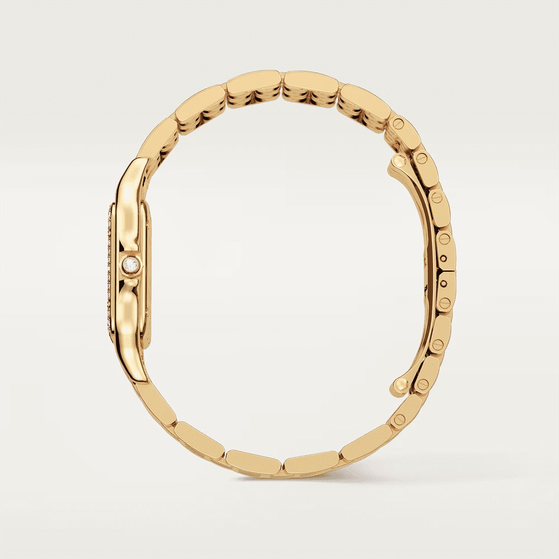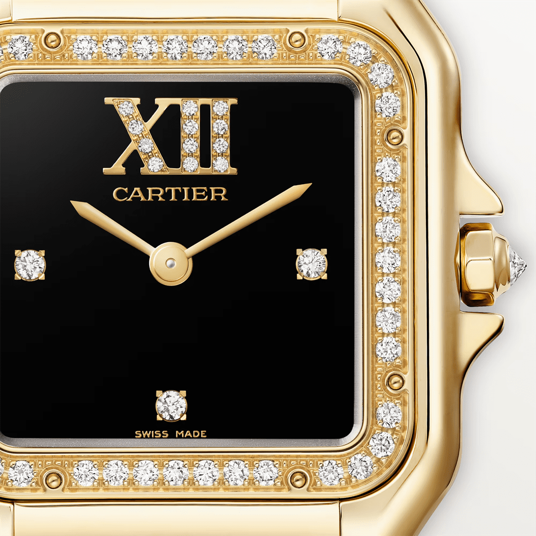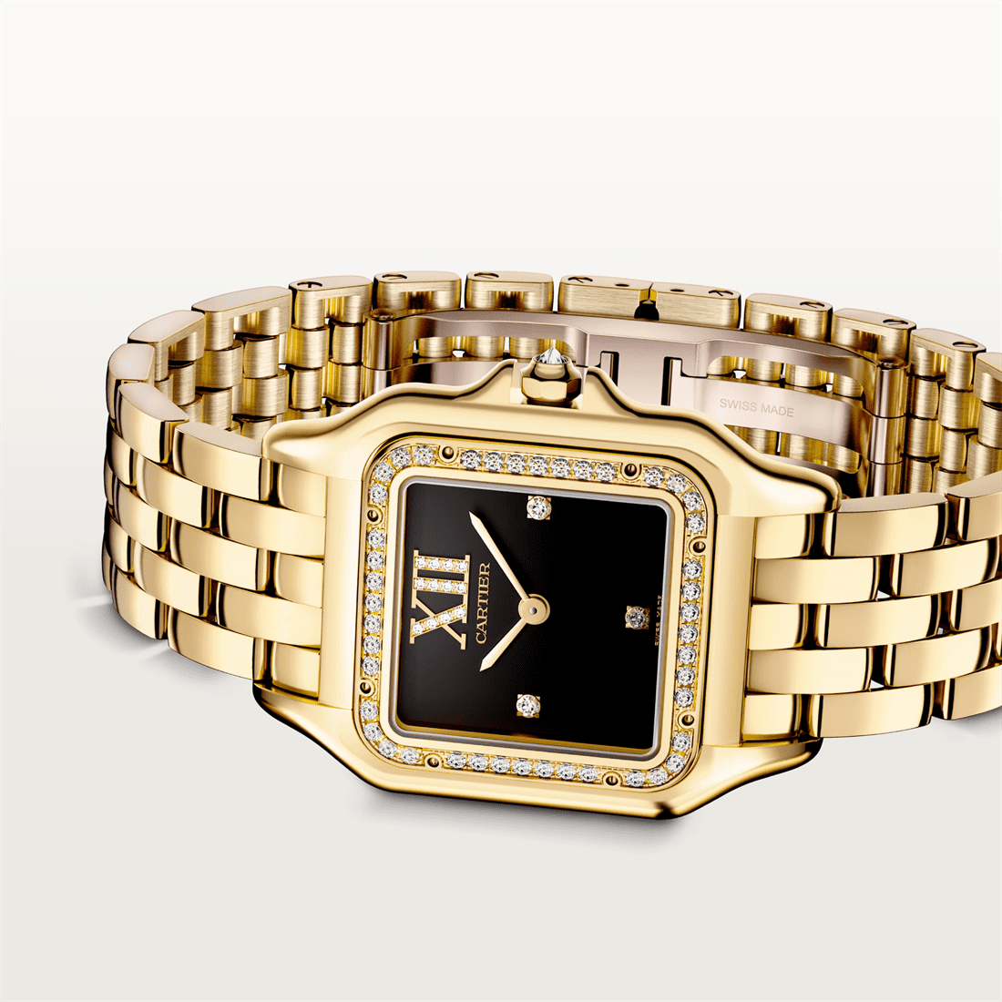 Panth??re de Cartier watch, medium model, quartz movement. 18K yellow gold (750/1000) case set with 44 brilliant-cut diamonds totaling 0.28 carats. Dimensions: 36.5 mm x 26.7 mm, thickness: 6.8 mm. 18K yellow gold (750/1000) octagonal crown set with a brilliant-cut diamond totaling 0.02 carats. Black lacquer dial set with 15 brilliant-cut diamonds totaling 0.03 carats, golden-finish sword-shaped hands. 18K yellow gold (750/1000) bracelet. water-resistant up to 3 bar (approx. 30 meters/100 feet).