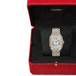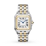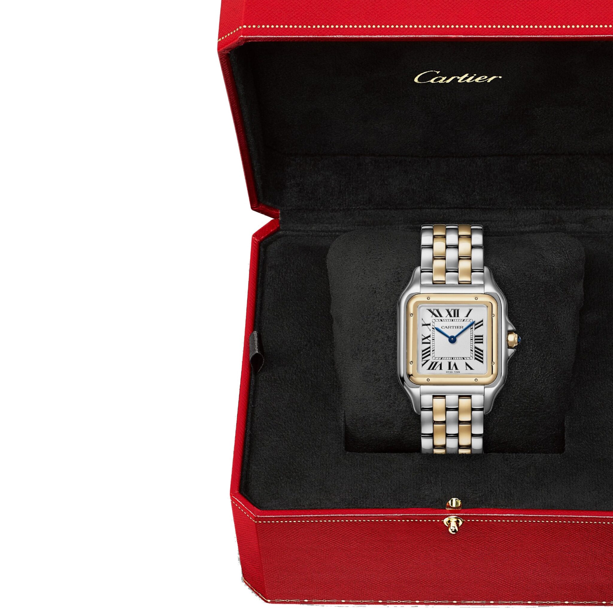 Panth??re de Cartier watch, large model, quartz movement. Yellow gold 750/1000 and steel case, dimensions: 31 mm x 42 mm, thickness: 6.71 mm, crown with a blue synthetic spinel, silvered dial, blued-steel sword-shaped hands, yellow gold 750/1000 and steel bracelet. Water-resistant up to 3 bar (approx. 30 metres).